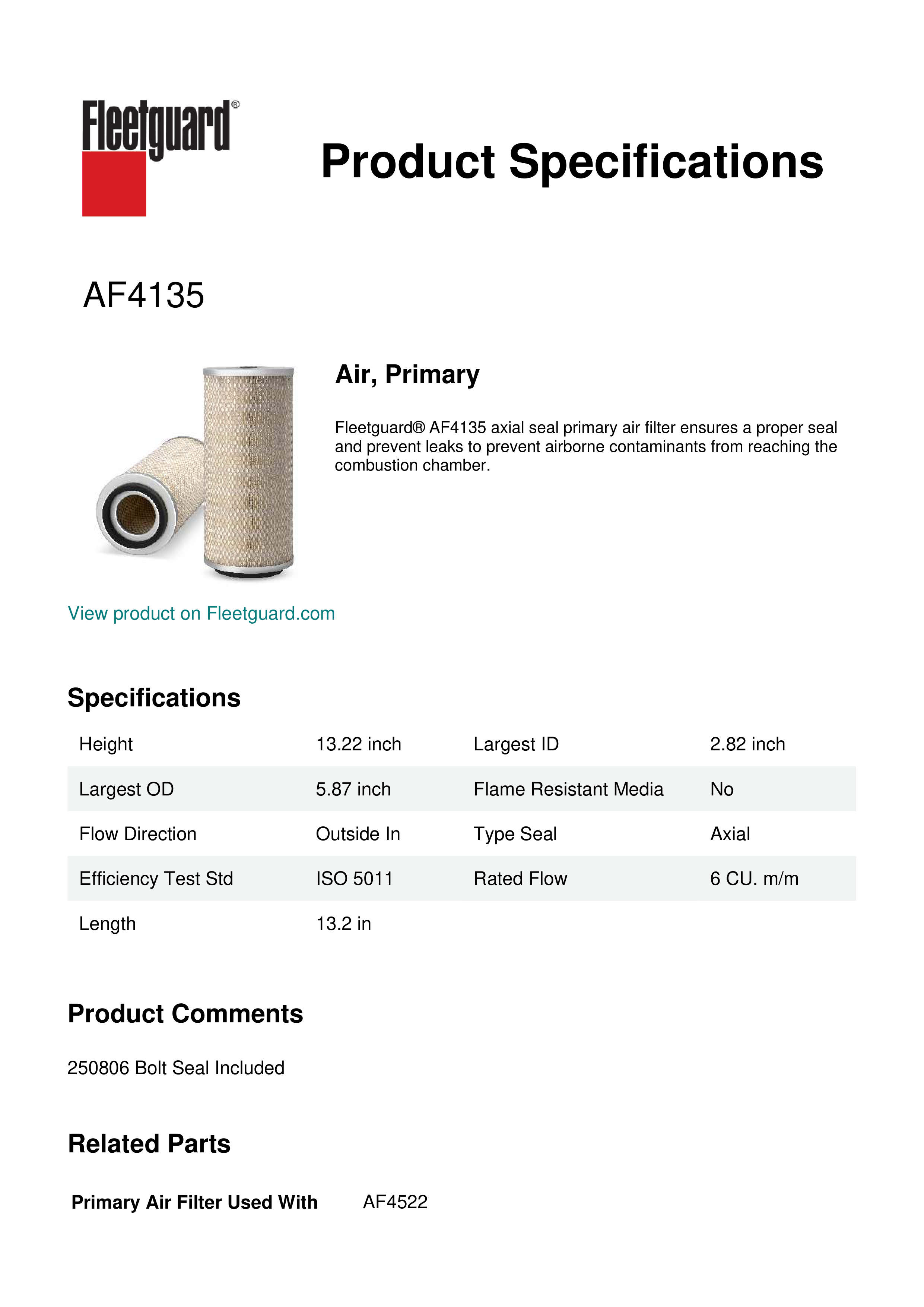 Fleetguard® AF4135 axial seal primary air filter ensures a proper seal and prevent leaks to prevent airborne contaminants from reaching the combustion chamber.Specification