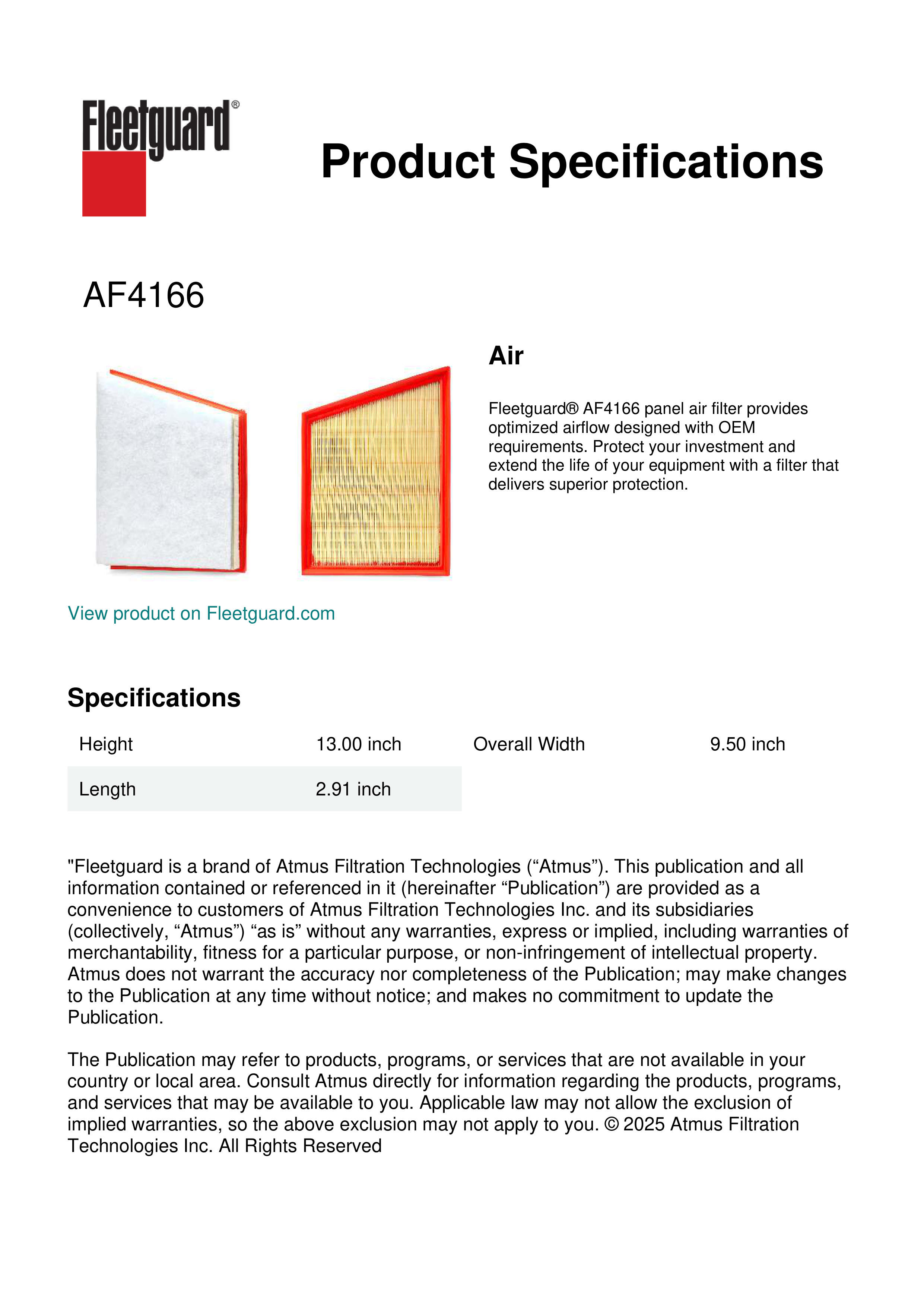 Fleetguard® AF4166 panel air filter provides optimized airflow designed with OEM requirements. Protect your investment and extend the life of your equipment with a filter that delivers superior protection.Specification