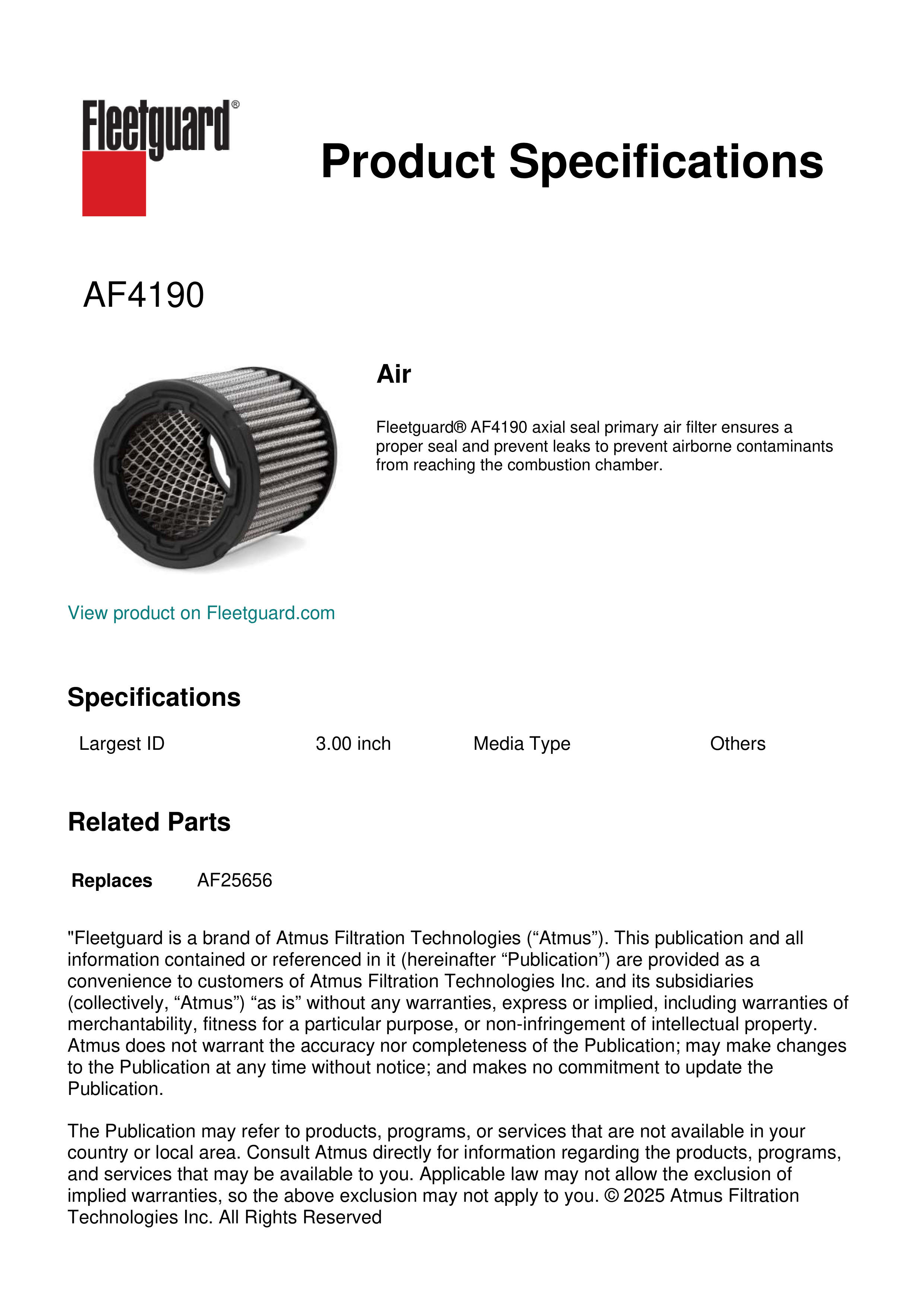 Fleetguard® AF4190 axial seal primary air filter ensures a proper seal and prevent leaks to prevent airborne contaminants from reaching the combustion chamber.
