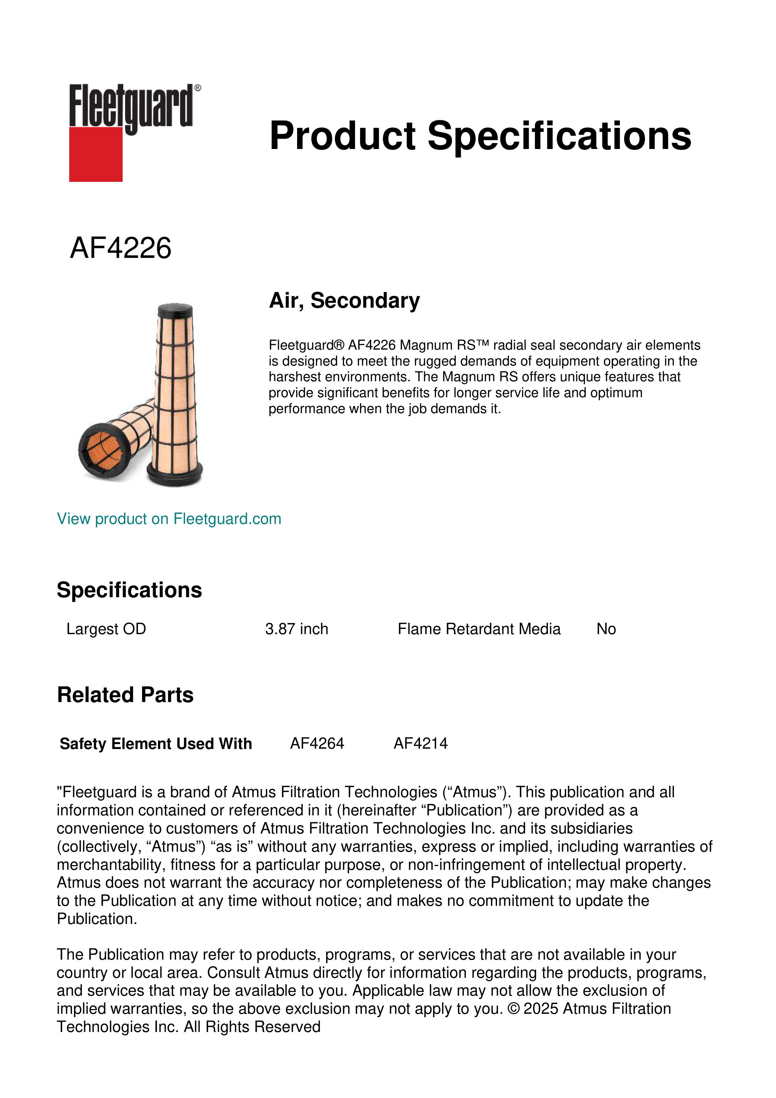 Fleetguard® AF4226 Magnum RS™ radial seal secondary air elements is designed to meet the rugged demands of equipment operating in the harshest environments. The Magnum RS offers unique features that provide significant benefits for longer service life and optimum performance when the job demands it.Specification