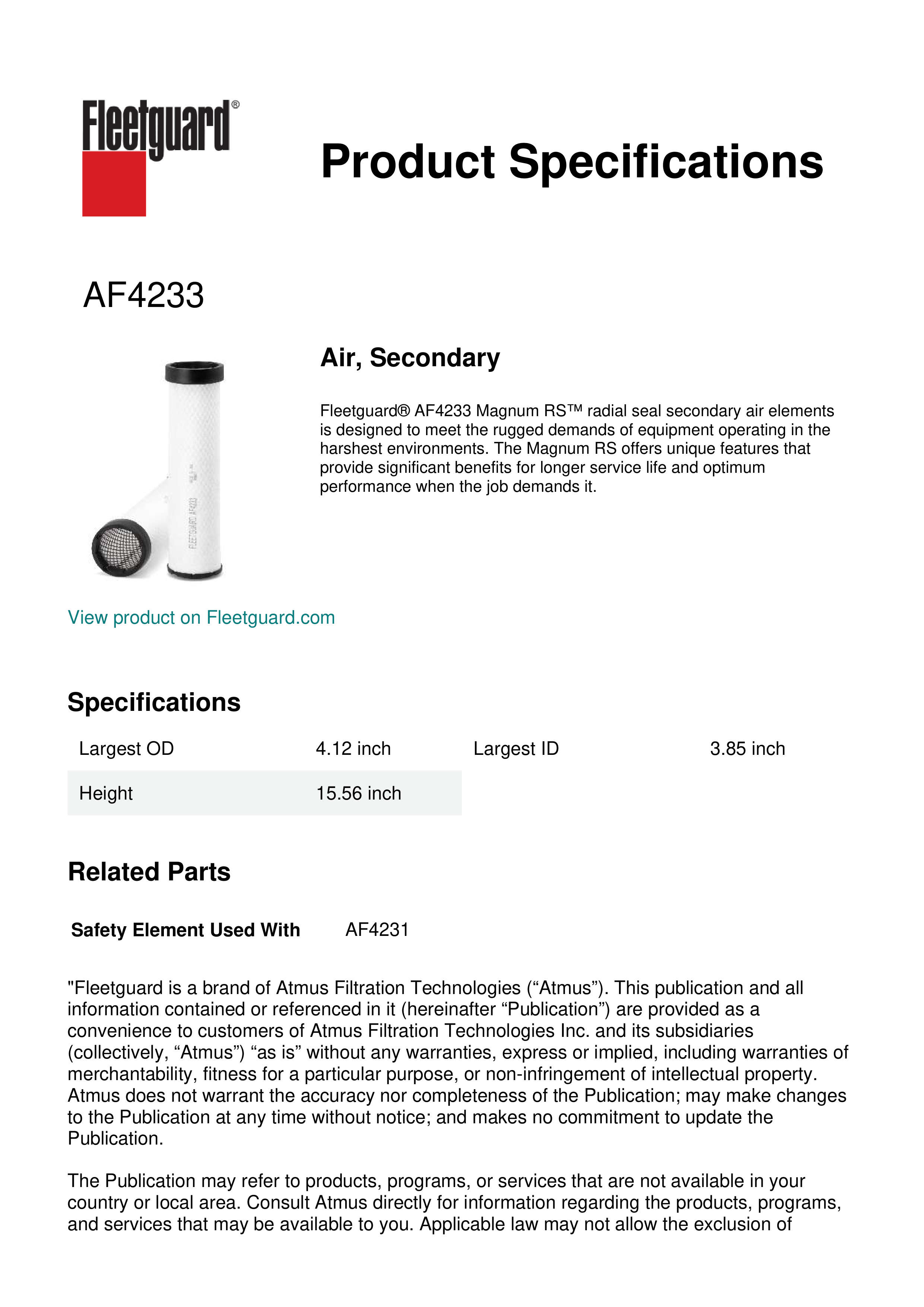 Fleetguard® AF4233 Magnum RS™ radial seal secondary air elements is designed to meet the rugged demands of equipment operating in the harshest environments. The Magnum RS offers unique features that provide significant benefits for longer service life and optimum performance when the job demands it.Specification