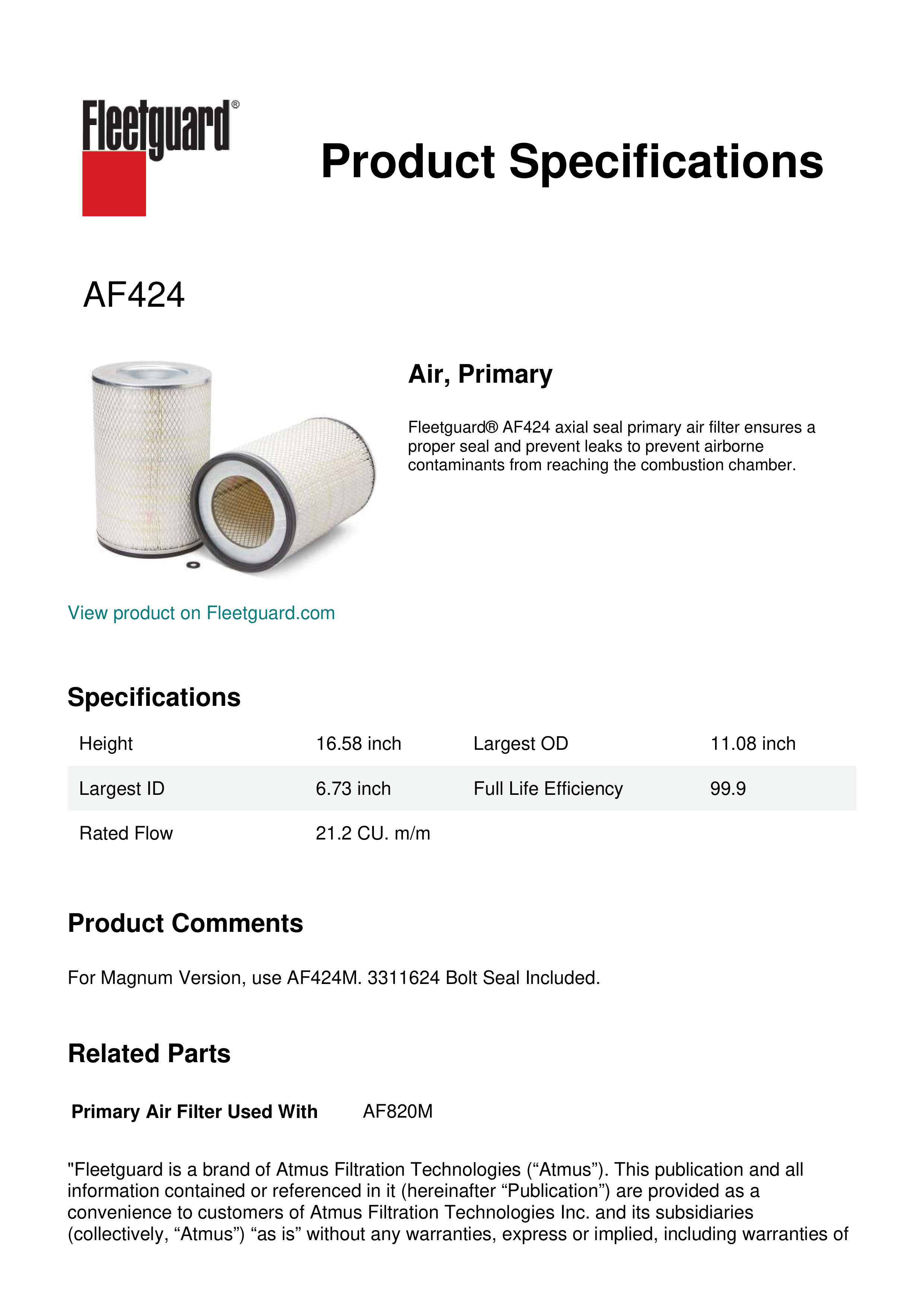 Fleetguard® AF424 axial seal primary air filter ensures a proper seal and prevent leaks to prevent airborne contaminants from reaching the combustion chamber.