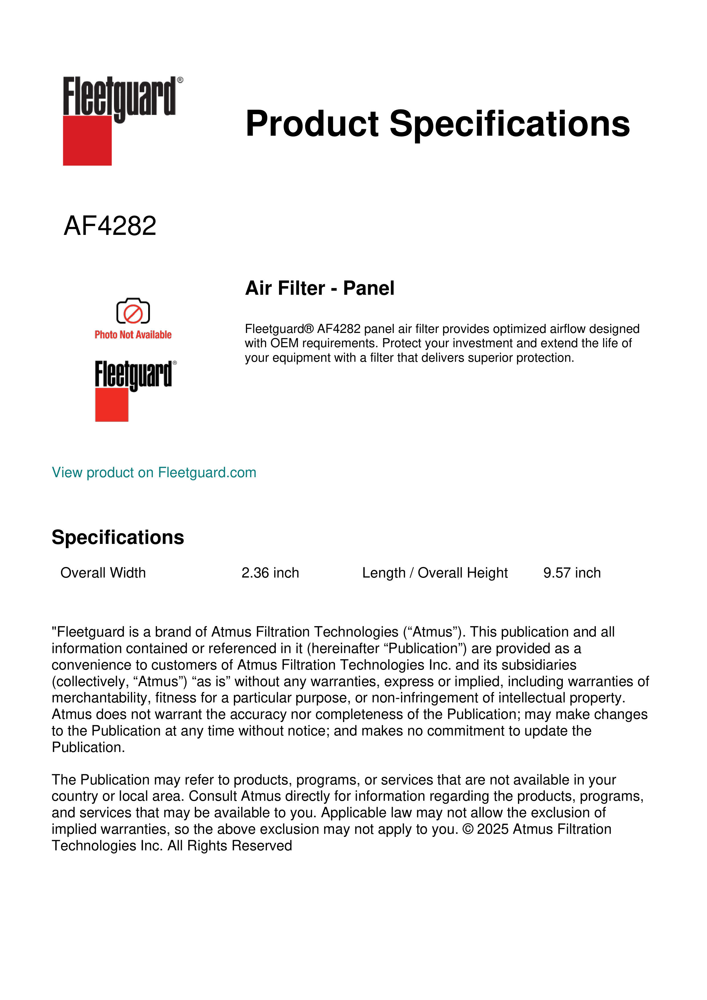 Fleetguard® AF4282 panel air filter provides optimized airflow designed with OEM requirements. Protect your investment and extend the life of your equipment with a filter that delivers superior protection.Specification