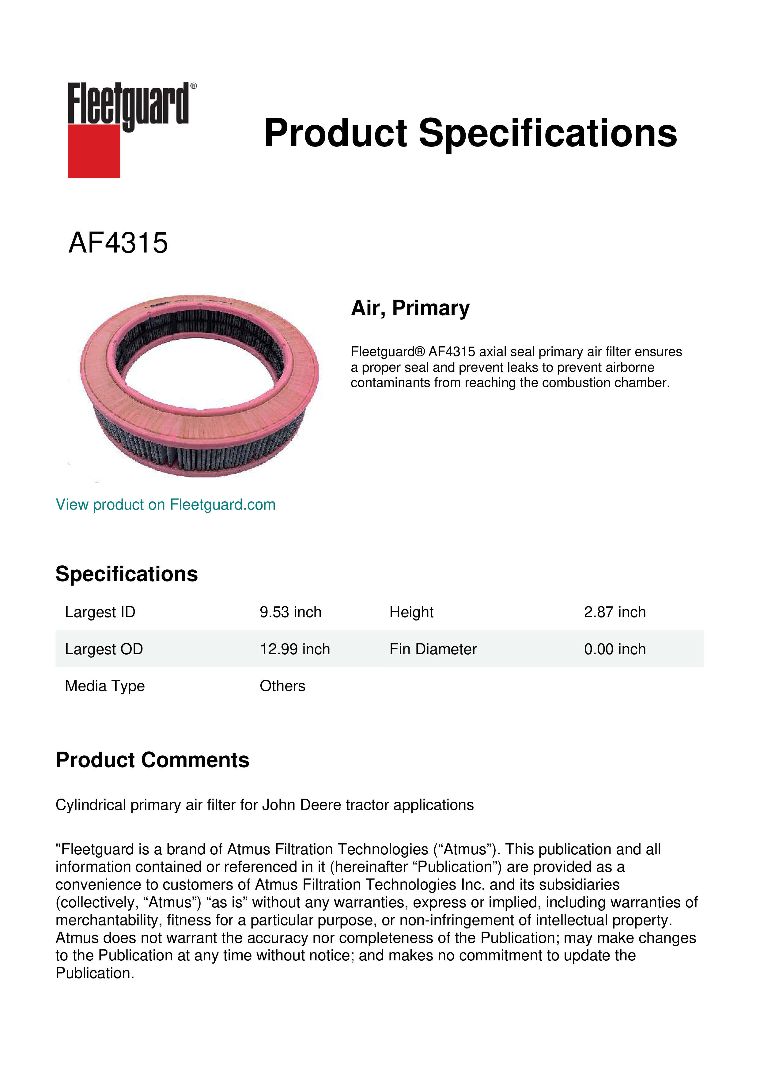 Fleetguard® AF4315 axial seal primary air filter ensures a proper seal and prevent leaks to prevent airborne contaminants from reaching the combustion chamber.