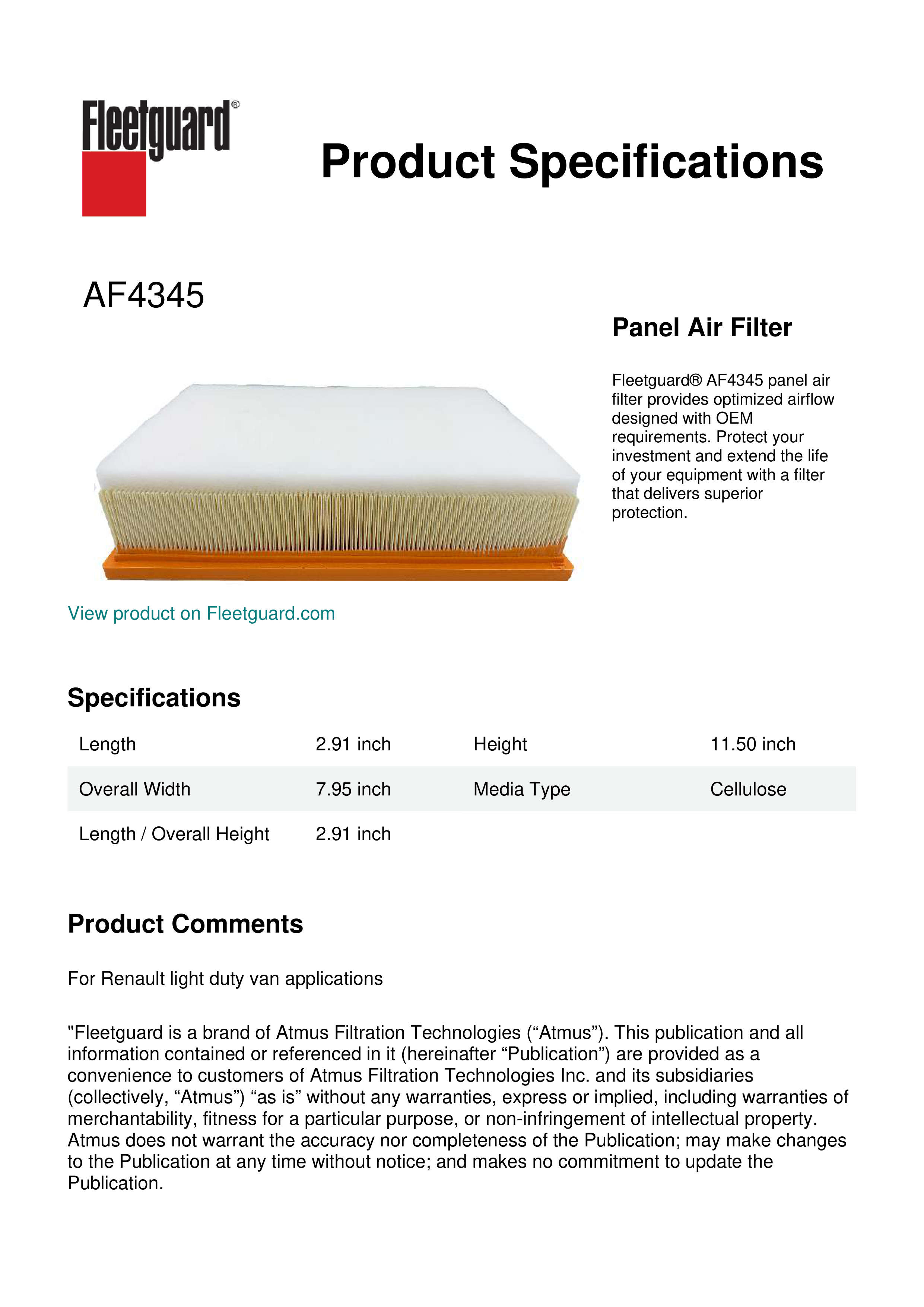Fleetguard® AF4345 panel air filter provides optimized airflow designed with OEM requirements. Protect your investment and extend the life of your equipment with a filter that delivers superior protection.Specification