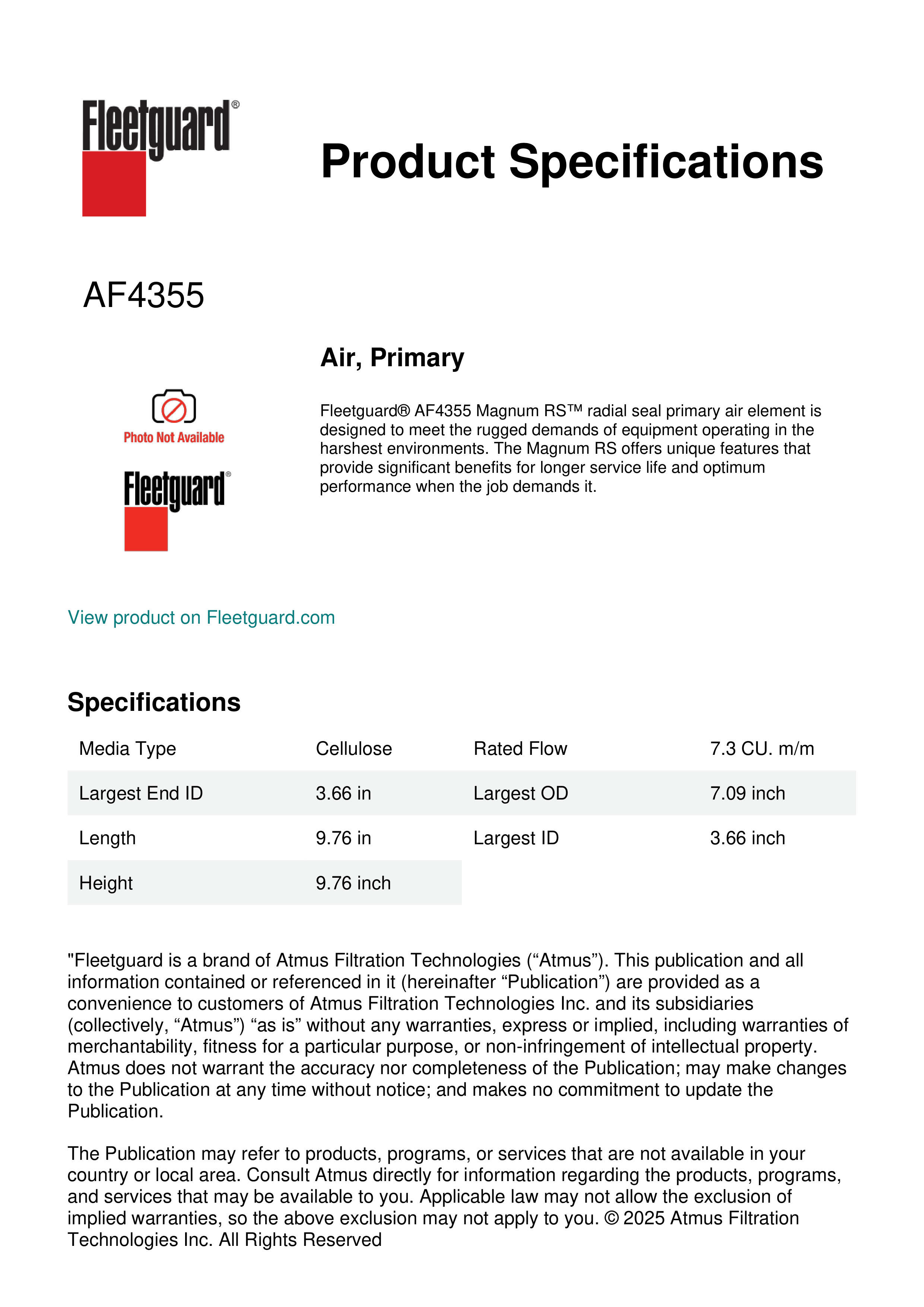 Fleetguard® AF4355 Magnum RS™ radial seal primary air element is designed to meet the rugged demands of equipment operating in the harshest environments. The Magnum RS offers unique features that provide significant benefits for longer service life and optimum performance when the job demands it.Specification