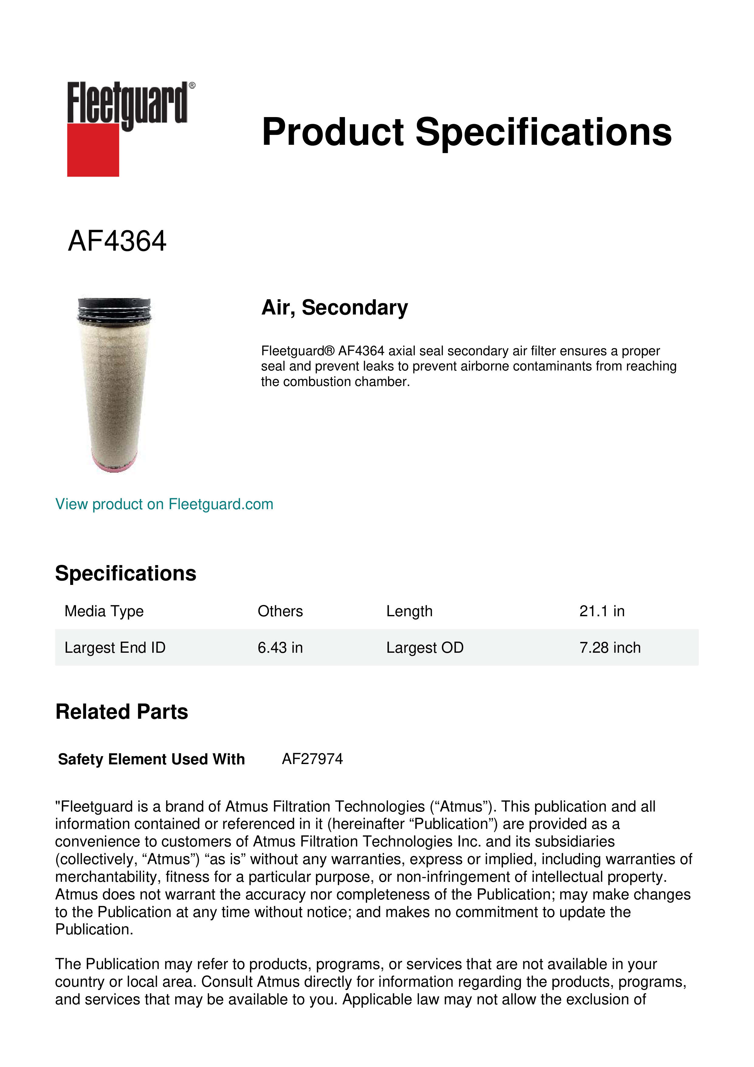 Fleetguard® AF4364 axial seal secondary air filter ensures a proper seal and prevent leaks to prevent airborne contaminants from reaching the combustion chamber.Specification