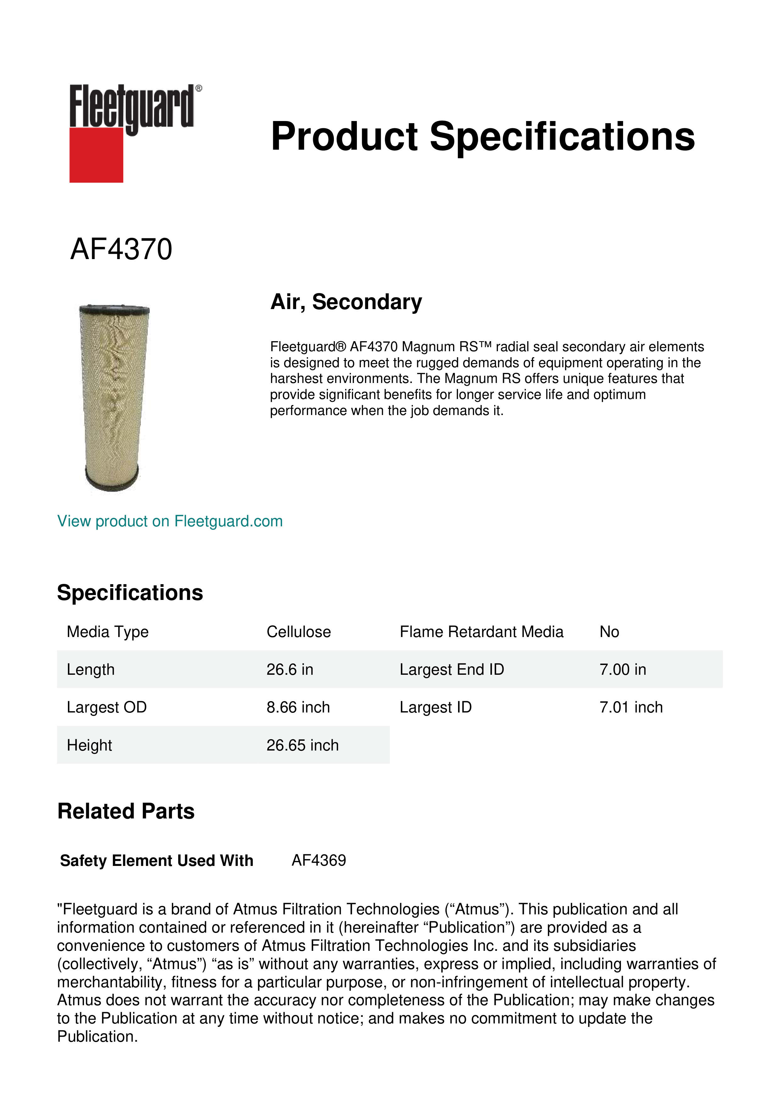 Fleetguard® AF4370 Magnum RS™ radial seal secondary air elements is designed to meet the rugged demands of equipment operating in the harshest environments. The Magnum RS offers unique features that provide significant benefits for longer service life and optimum performance when the job demands it.Specification