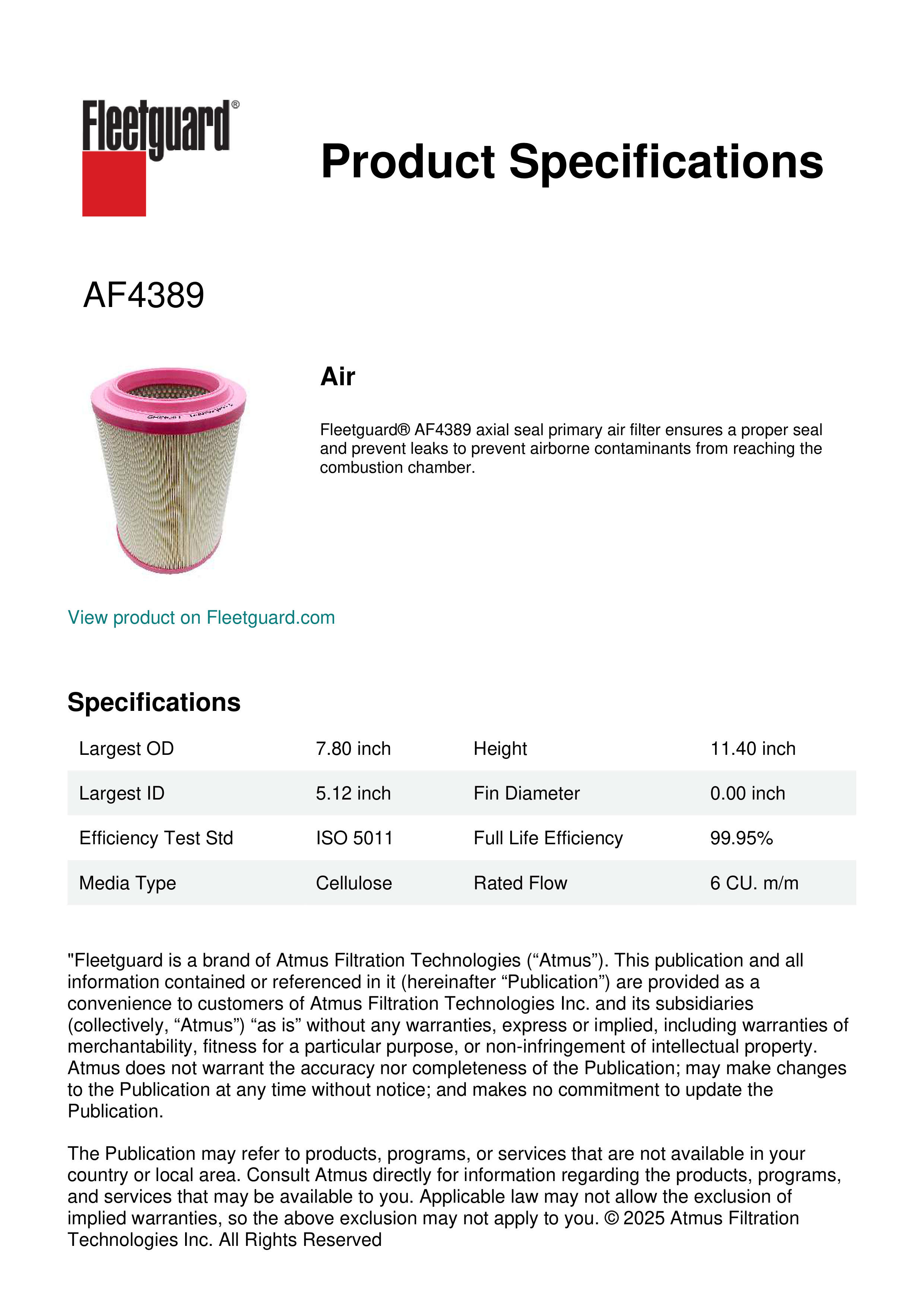 Fleetguard® AF4389 axial seal primary air filter ensures a proper seal and prevent leaks to prevent airborne contaminants from reaching the combustion chamber.