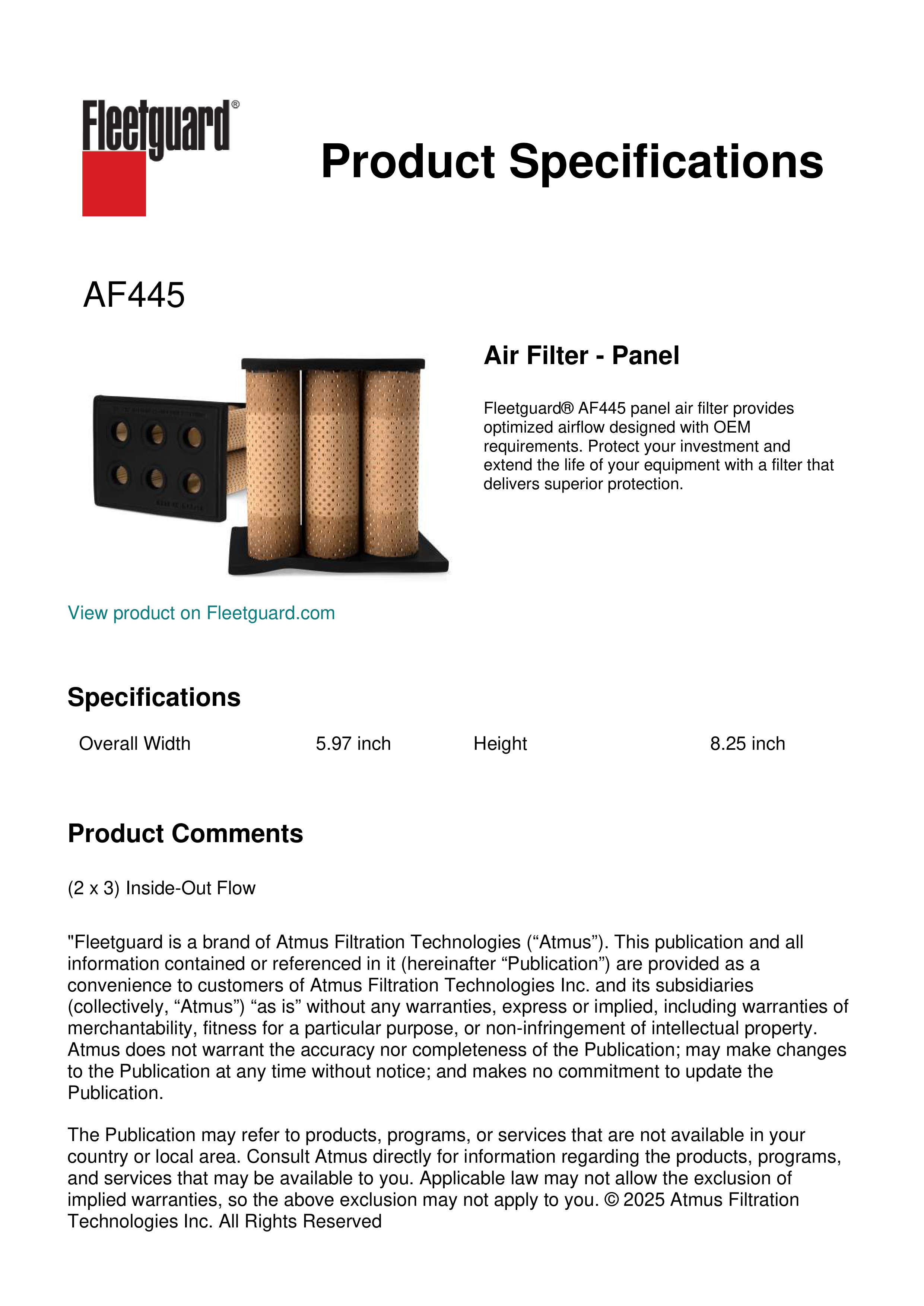 Fleetguard® AF445 panel air filter provides optimized airflow designed with OEM requirements. Protect your investment and extend the life of your equipment with a filter that delivers superior protection.Specification
