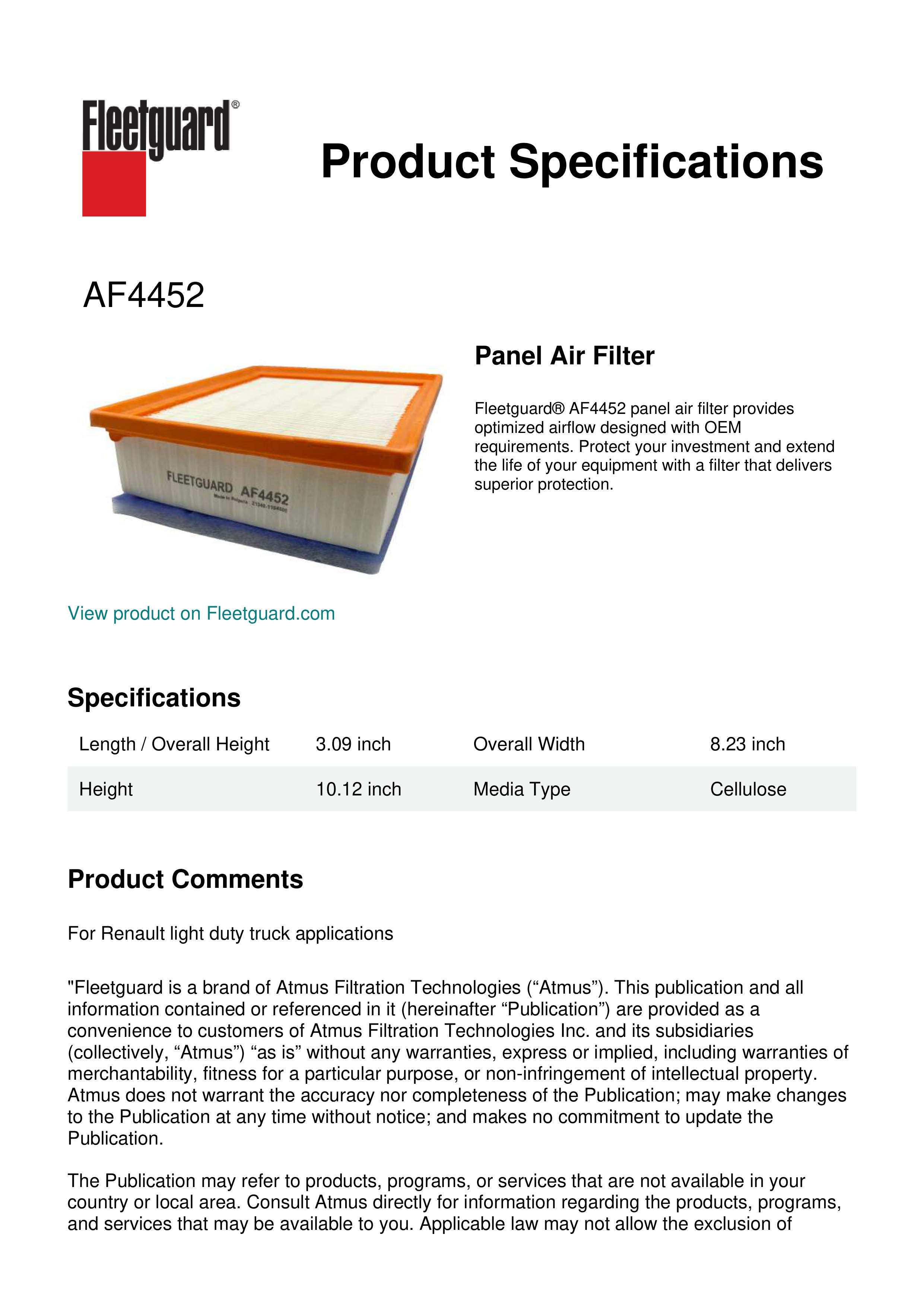 Fleetguard® AF4452 panel air filter provides optimized airflow designed with OEM requirements. Protect your investment and extend the life of your equipment with a filter that delivers superior protection.Specification
