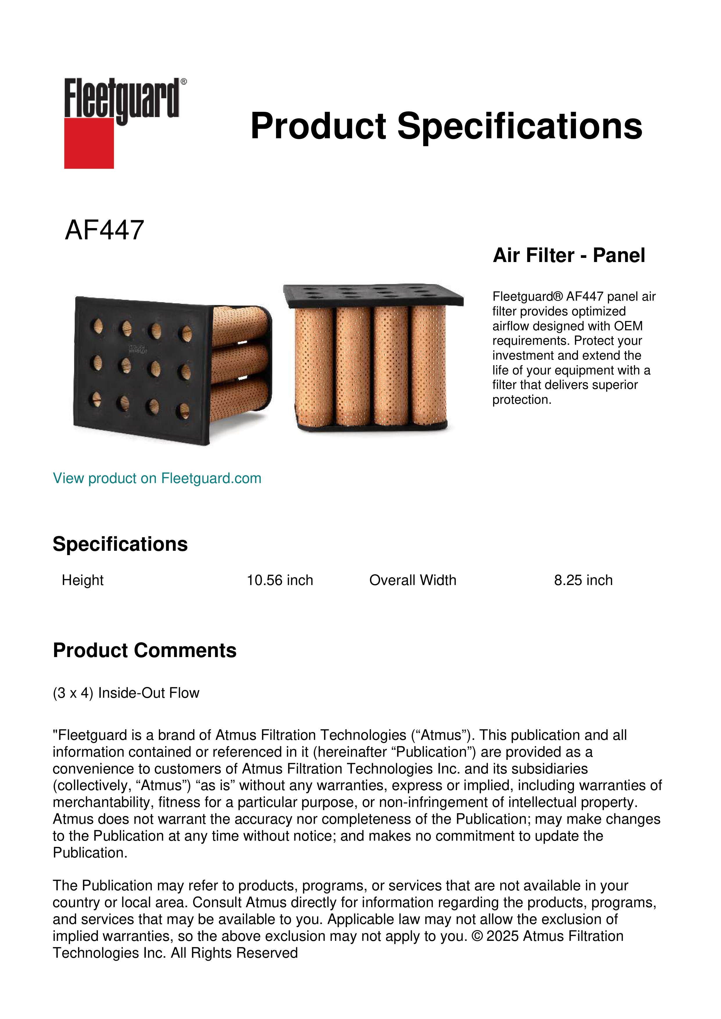 Fleetguard® AF447 panel air filter provides optimized airflow designed with OEM requirements. Protect your investment and extend the life of your equipment with a filter that delivers superior protection.Specification