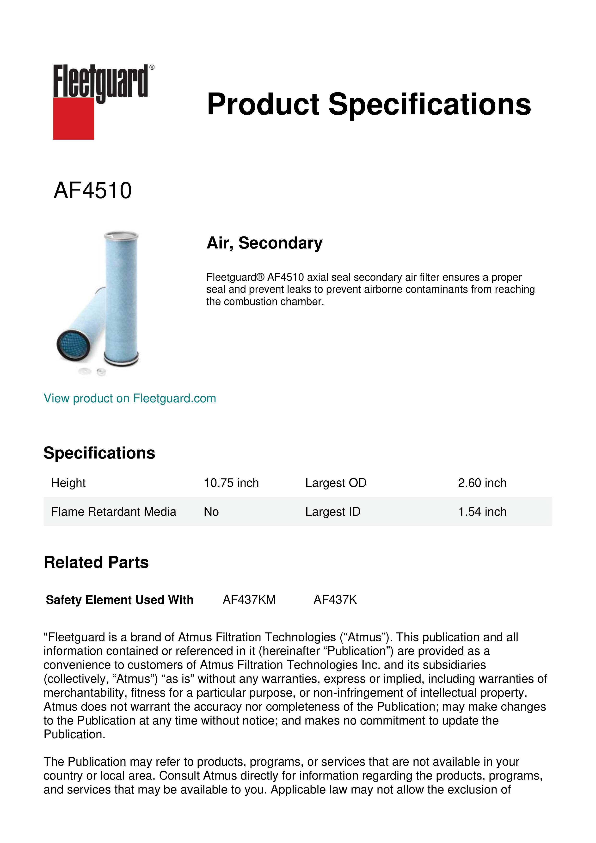 Fleetguard® AF4510 axial seal secondary air filter ensures a proper seal and prevent leaks to prevent airborne contaminants from reaching the combustion chamber.Specification