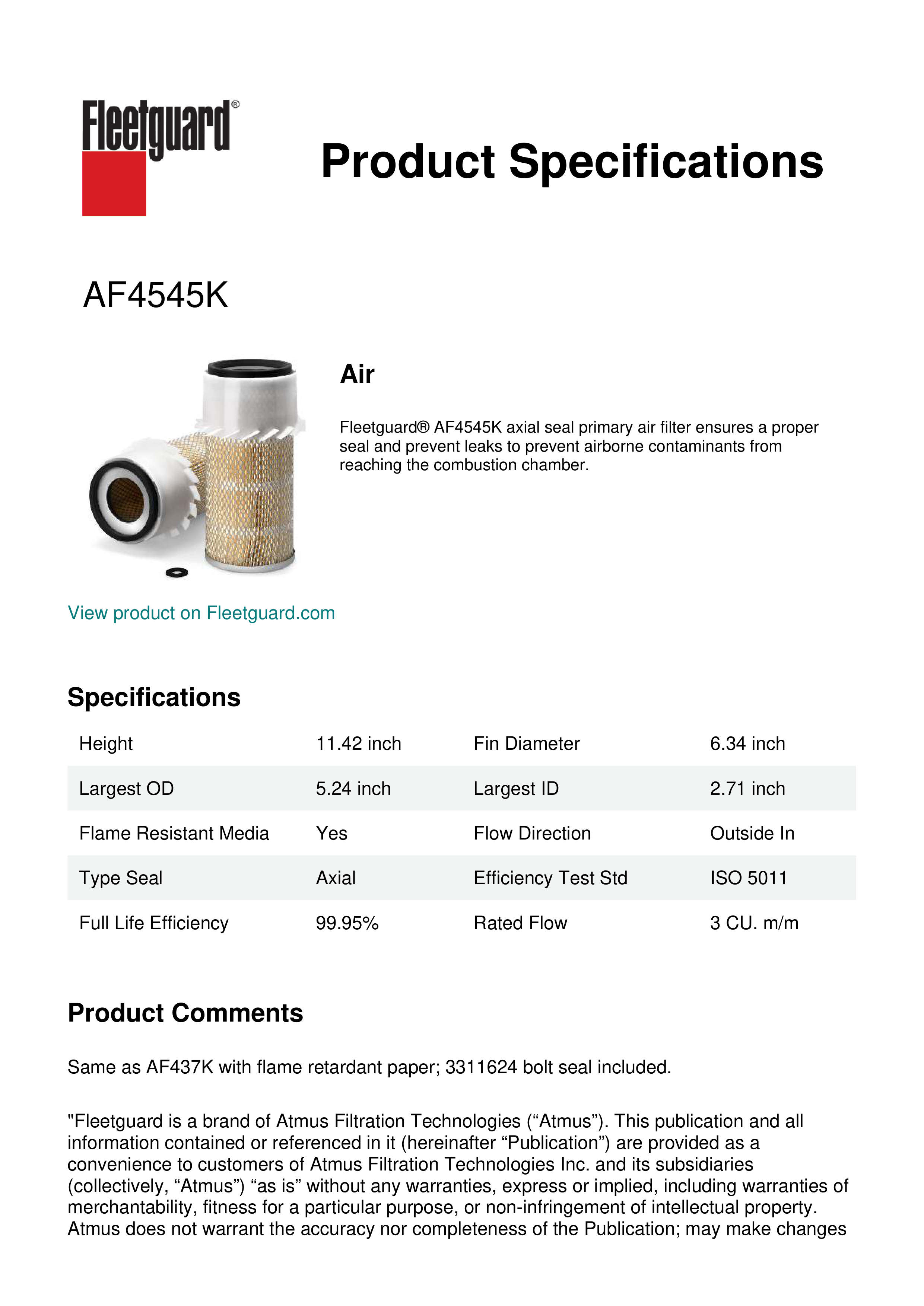 Fleetguard® AF4545K axial seal primary air filter ensures a proper seal and prevent leaks to prevent airborne contaminants from reaching the combustion chamber.