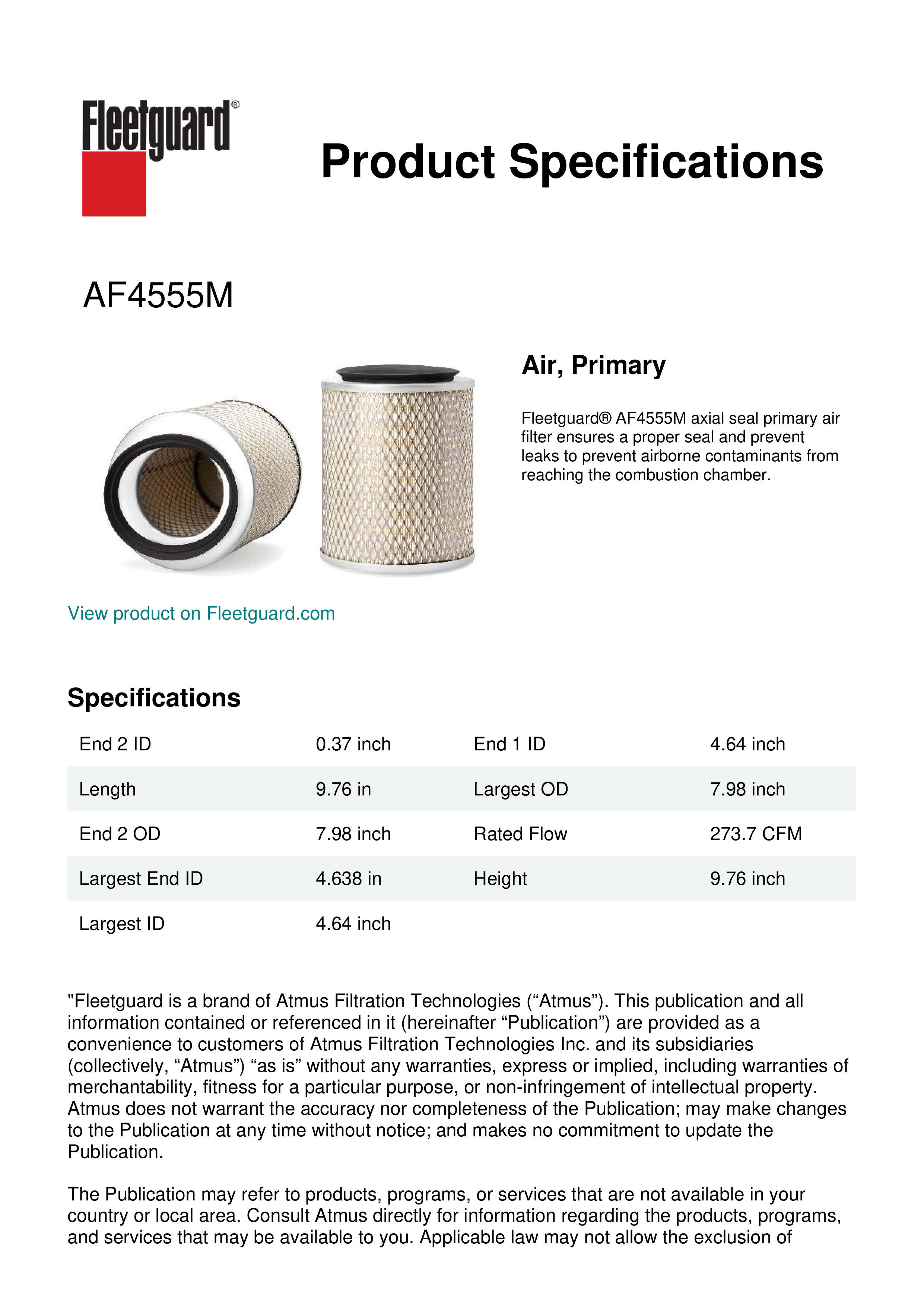 Fleetguard® AF4555M axial seal primary air filter ensures a proper seal and prevent leaks to prevent airborne contaminants from reaching the combustion chamber.Specification