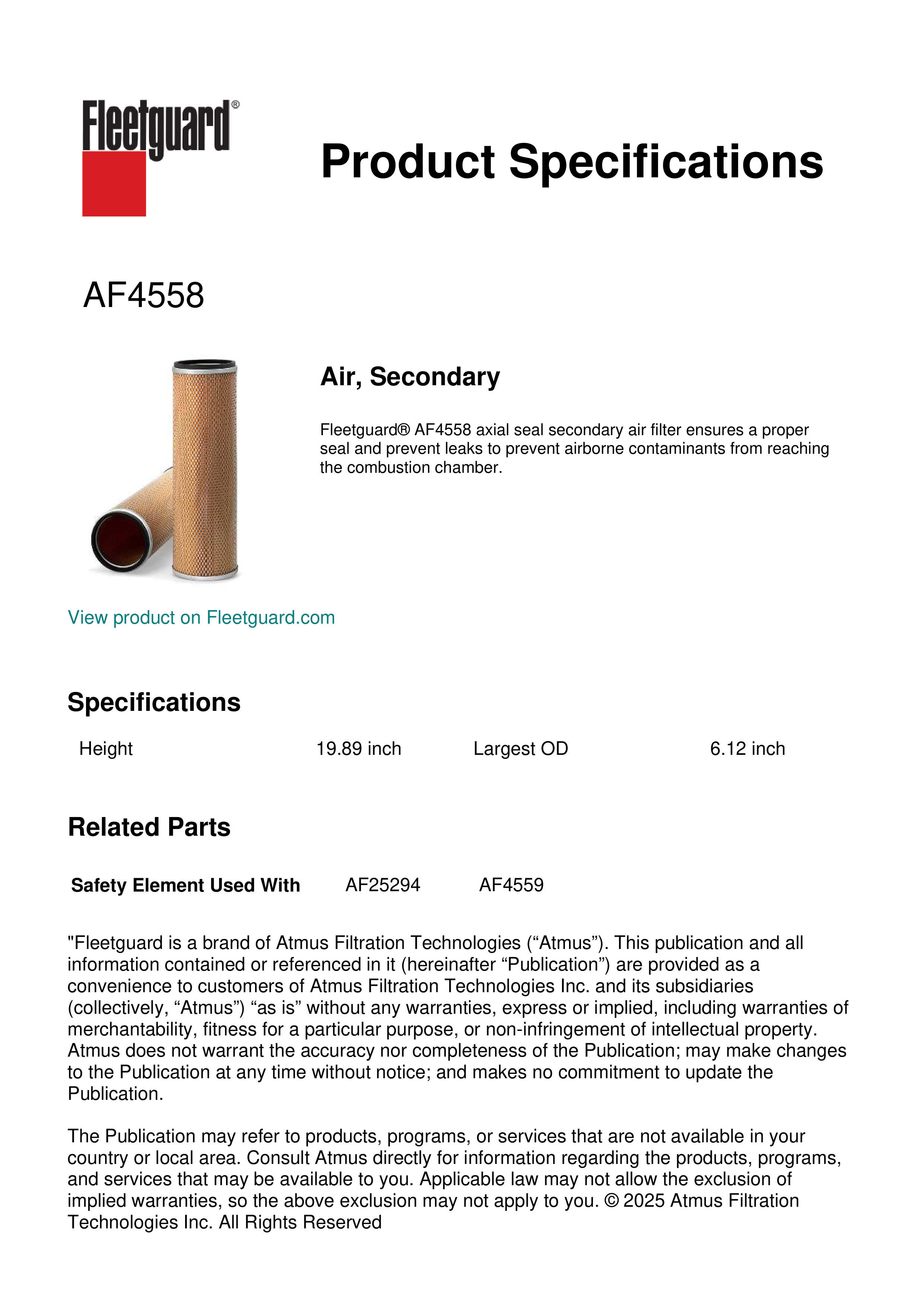 Fleetguard® AF4558 axial seal secondary air filter ensures a proper seal and prevent leaks to prevent airborne contaminants from reaching the combustion chamber.Specification