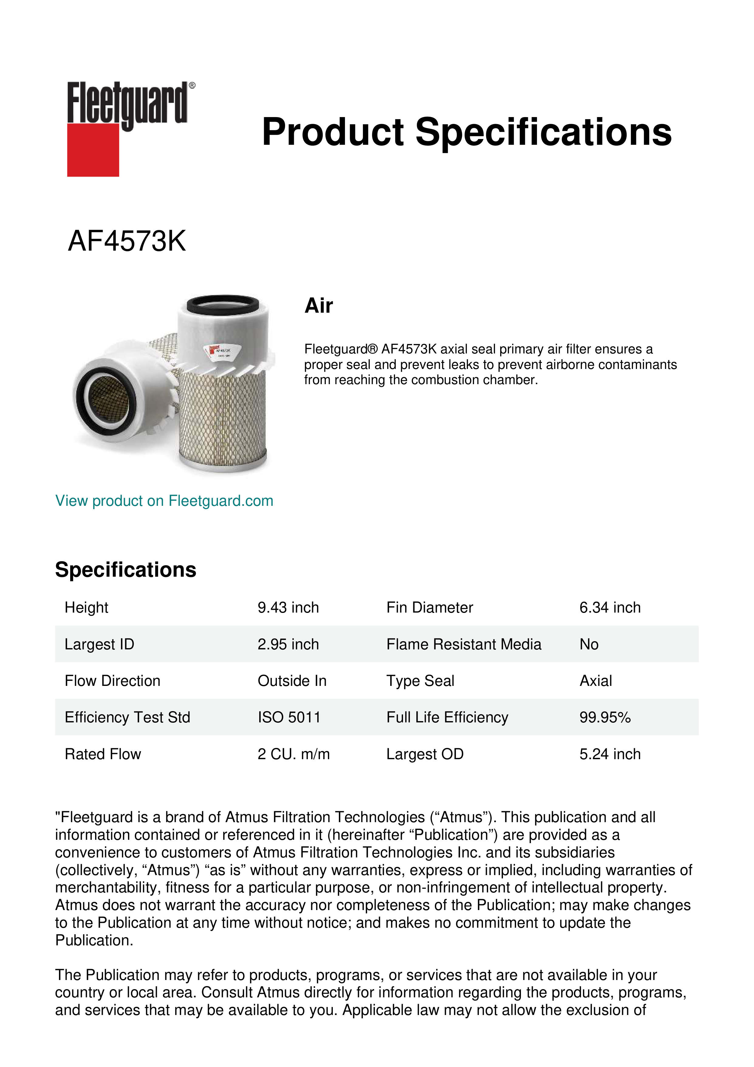 Fleetguard® AF4573K axial seal primary air filter ensures a proper seal and prevent leaks to prevent airborne contaminants from reaching the combustion chamber.Specification