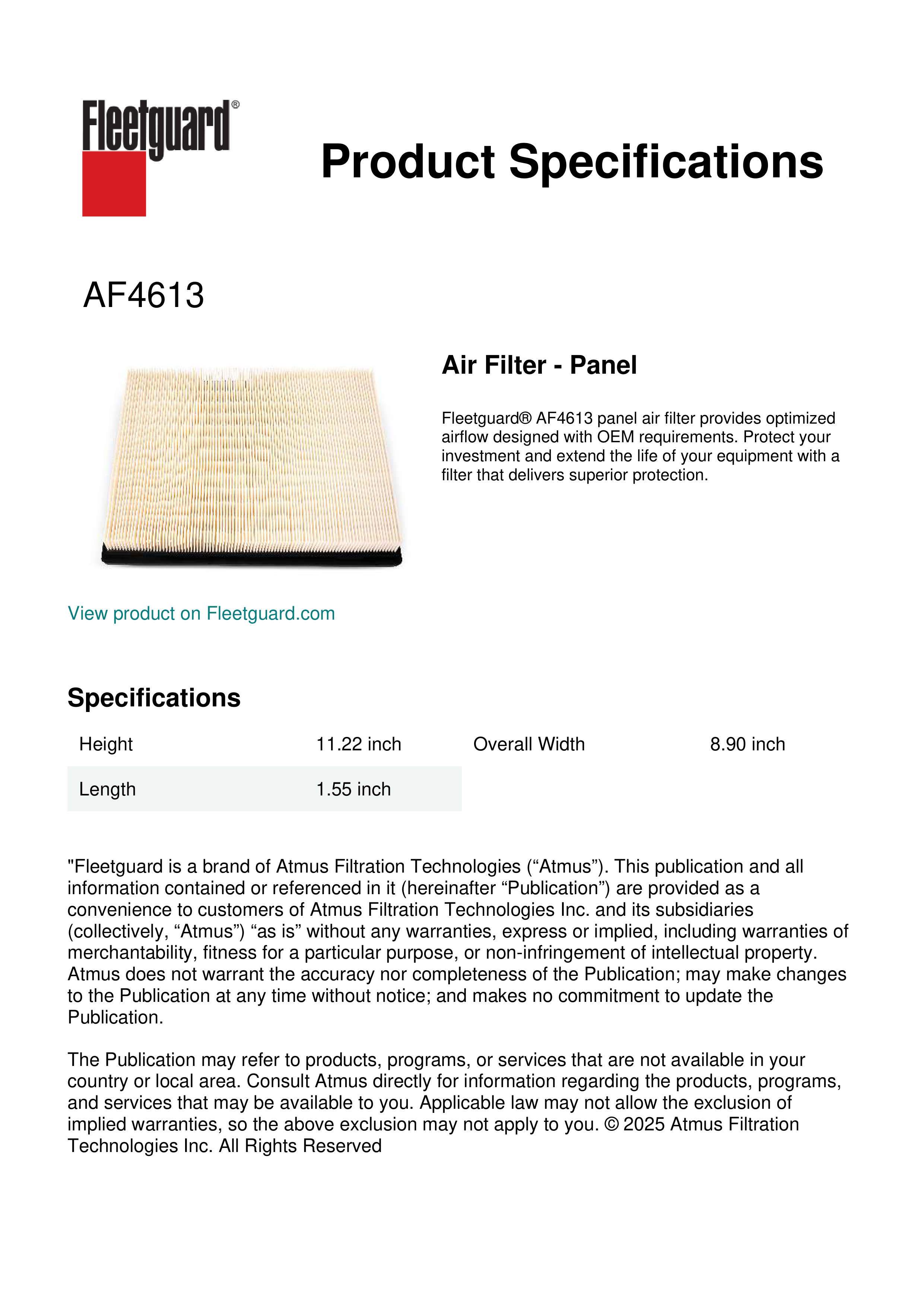Fleetguard® AF4613 panel air filter provides optimized airflow designed with OEM requirements. Protect your investment and extend the life of your equipment with a filter that delivers superior protection.Specification