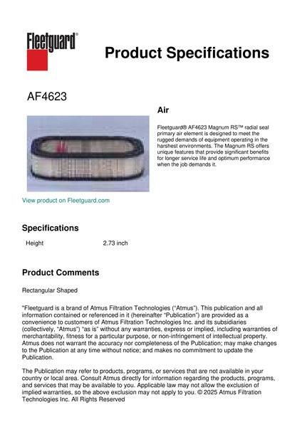 Fleetguard® AF4623 Magnum RS™ radial seal primary air element is designed to meet the rugged demands of equipment operating in the harshest environments. The Magnum RS offers unique features that provide significant benefits for longer service life and optimum performance when the job demands it.Specification
