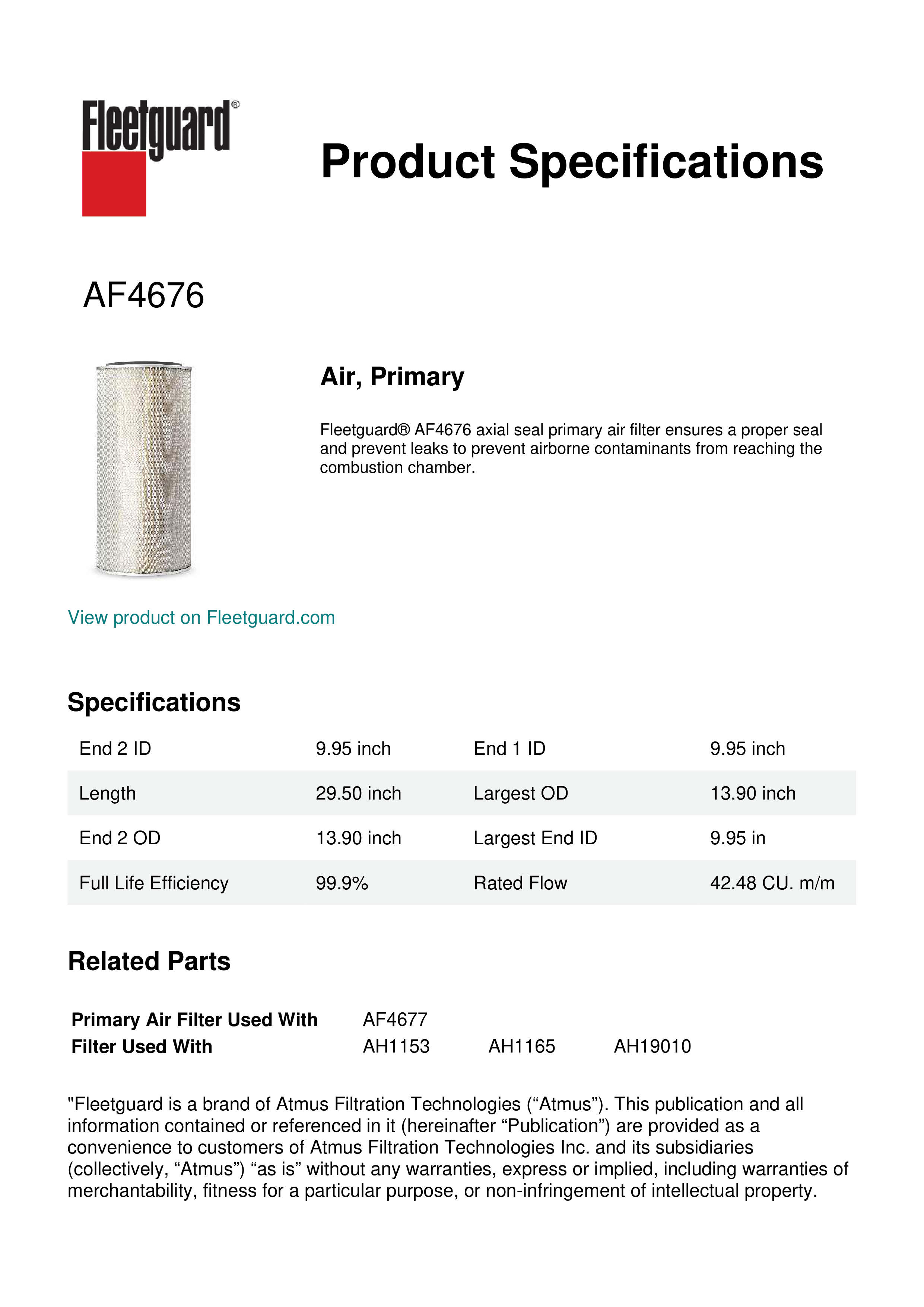 Fleetguard® AF4676 axial seal primary air filter ensures a proper seal and prevent leaks to prevent airborne contaminants from reaching the combustion chamber.