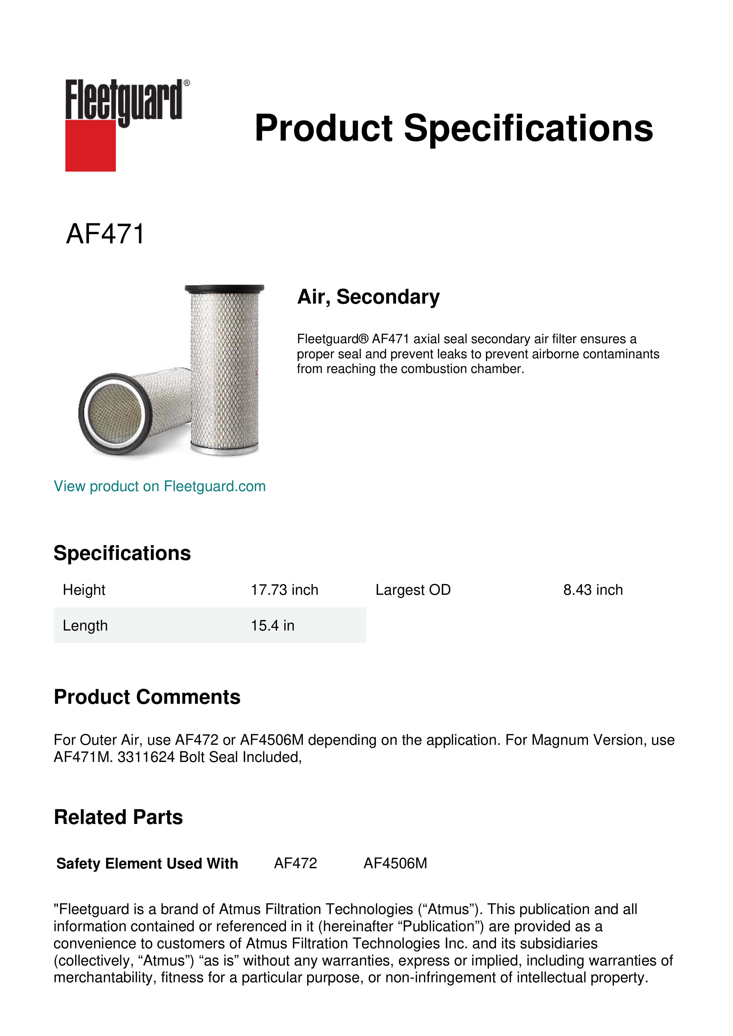 Fleetguard® AF471 axial seal secondary air filter ensures a proper seal and prevent leaks to prevent airborne contaminants from reaching the combustion chamber.Specification