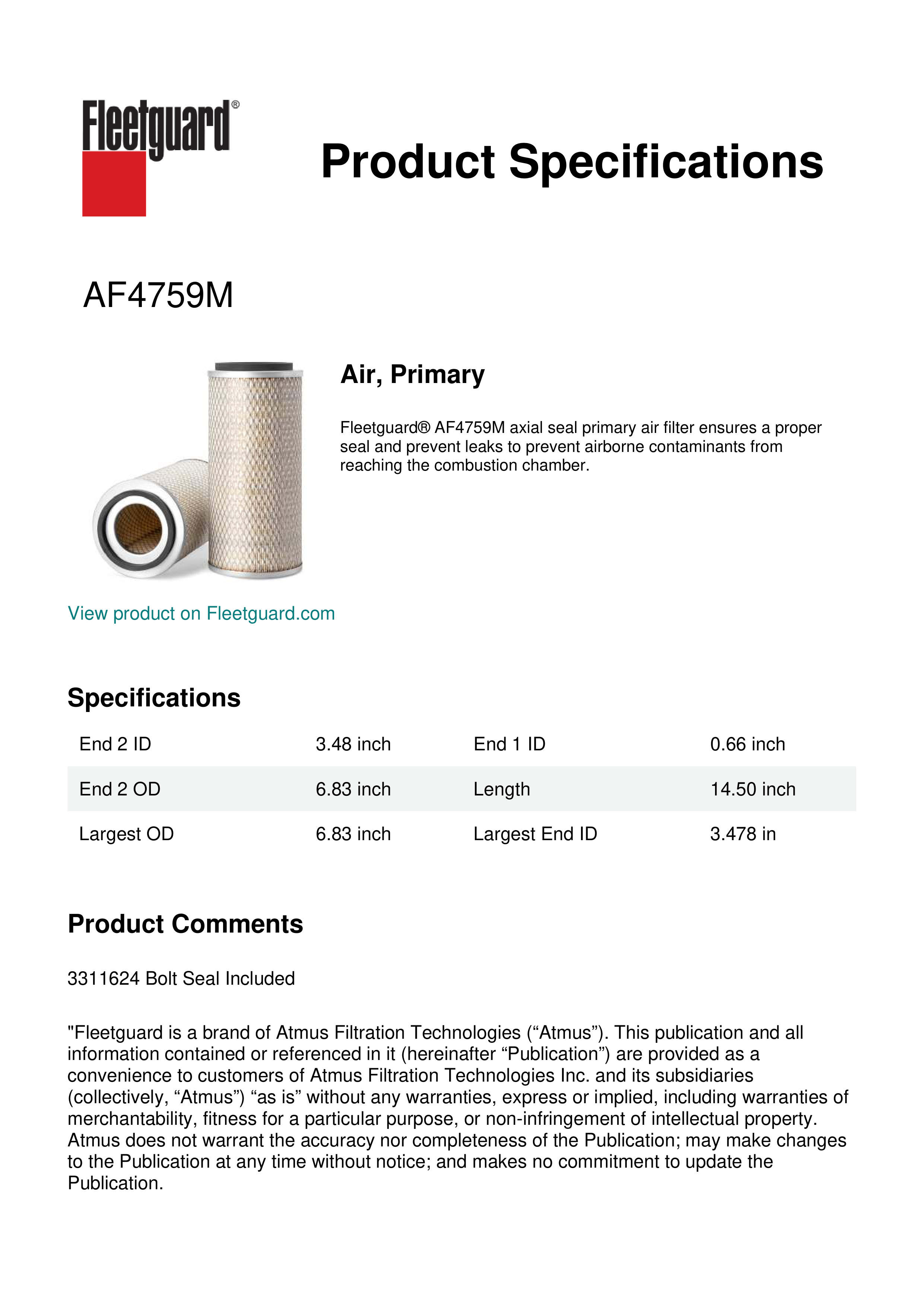Fleetguard® AF4759M axial seal primary air filter ensures a proper seal and prevent leaks to prevent airborne contaminants from reaching the combustion chamber.
