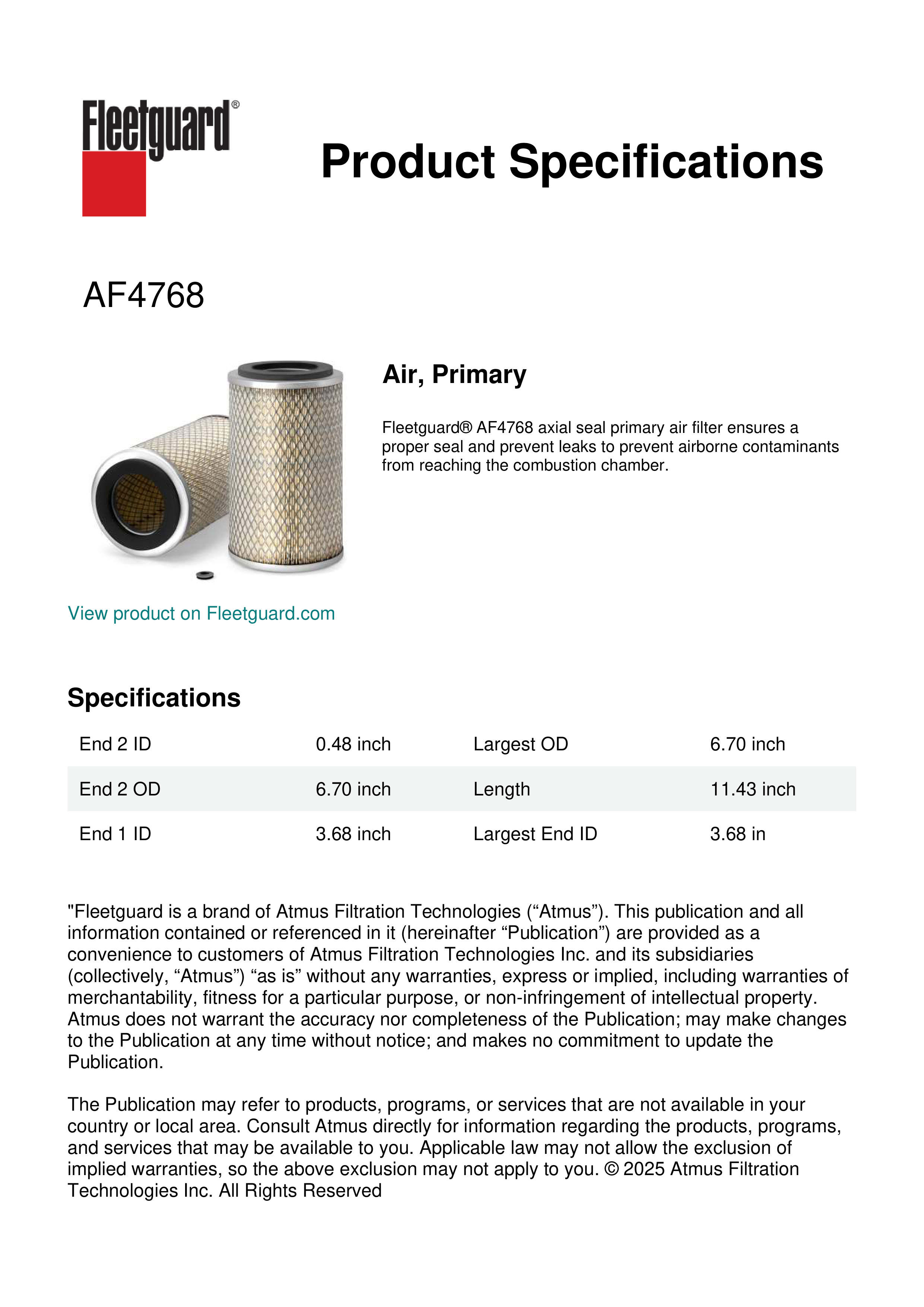 Fleetguard® AF4768 axial seal primary air filter ensures a proper seal and prevent leaks to prevent airborne contaminants from reaching the combustion chamber.