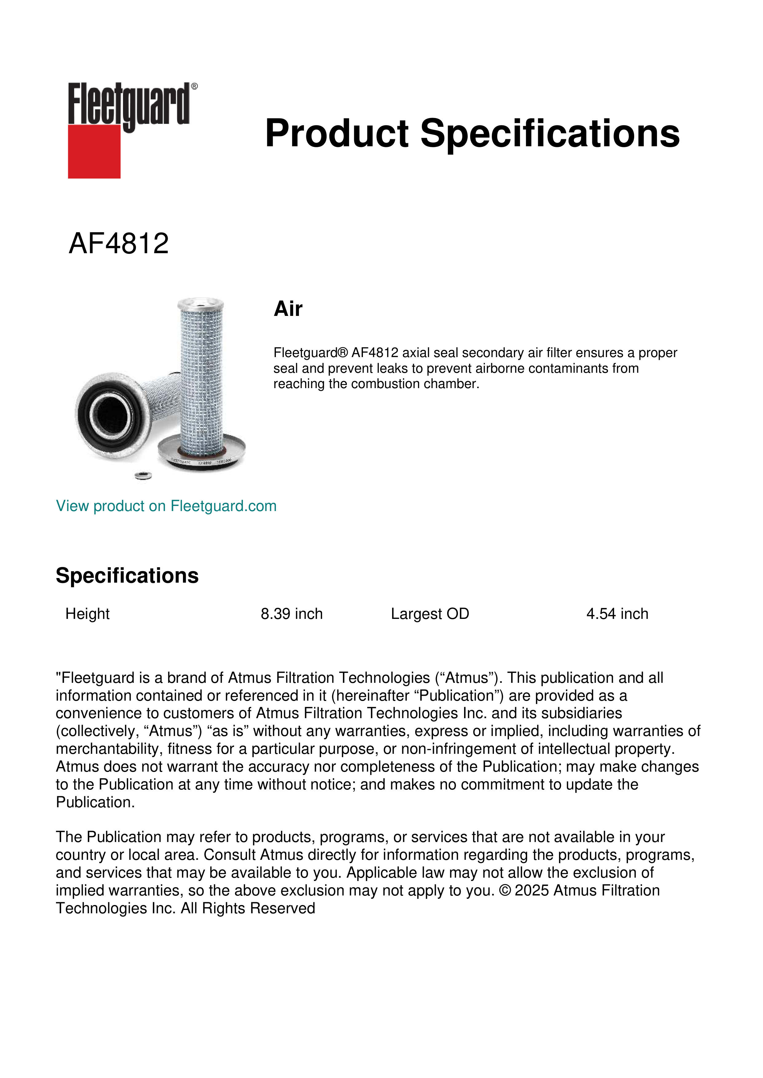 Fleetguard® AF4812 axial seal secondary air filter ensures a proper seal and prevent leaks to prevent airborne contaminants from reaching the combustion chamber.Specification