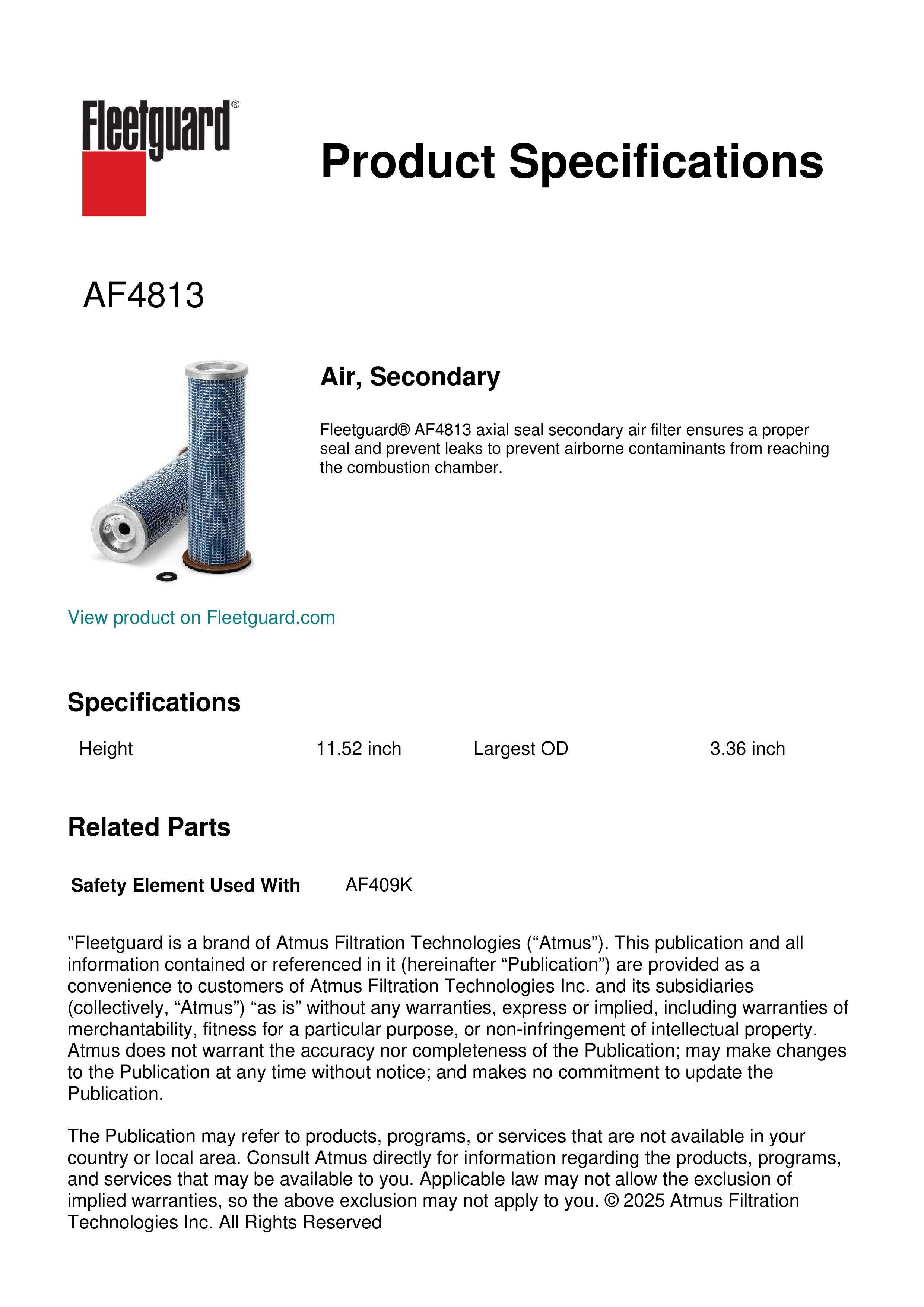 Fleetguard® AF4813 axial seal secondary air filter ensures a proper seal and prevent leaks to prevent airborne contaminants from reaching the combustion chamber.Specification