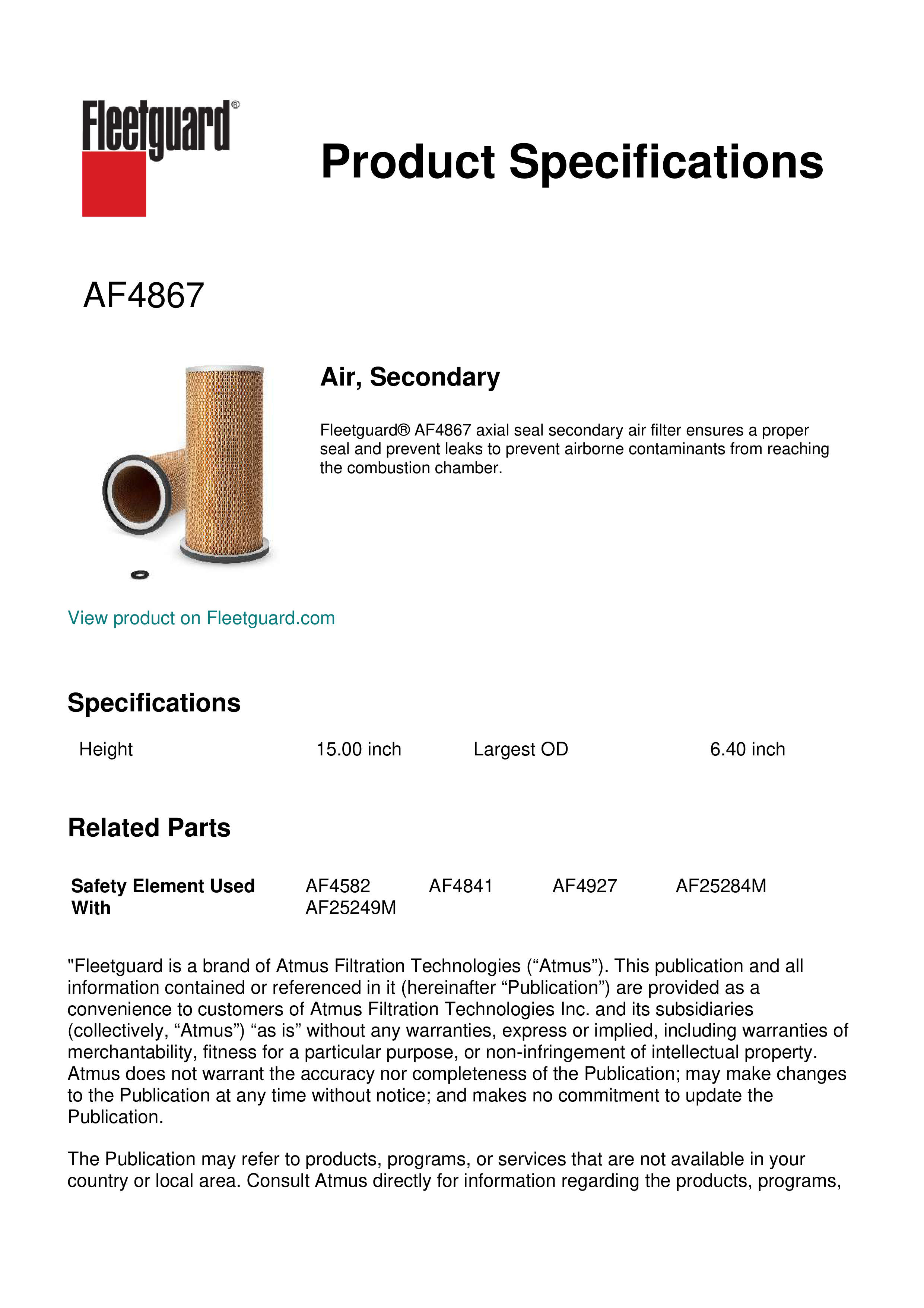 Fleetguard® AF4867 axial seal secondary air filter ensures a proper seal and prevent leaks to prevent airborne contaminants from reaching the combustion chamber.Specification