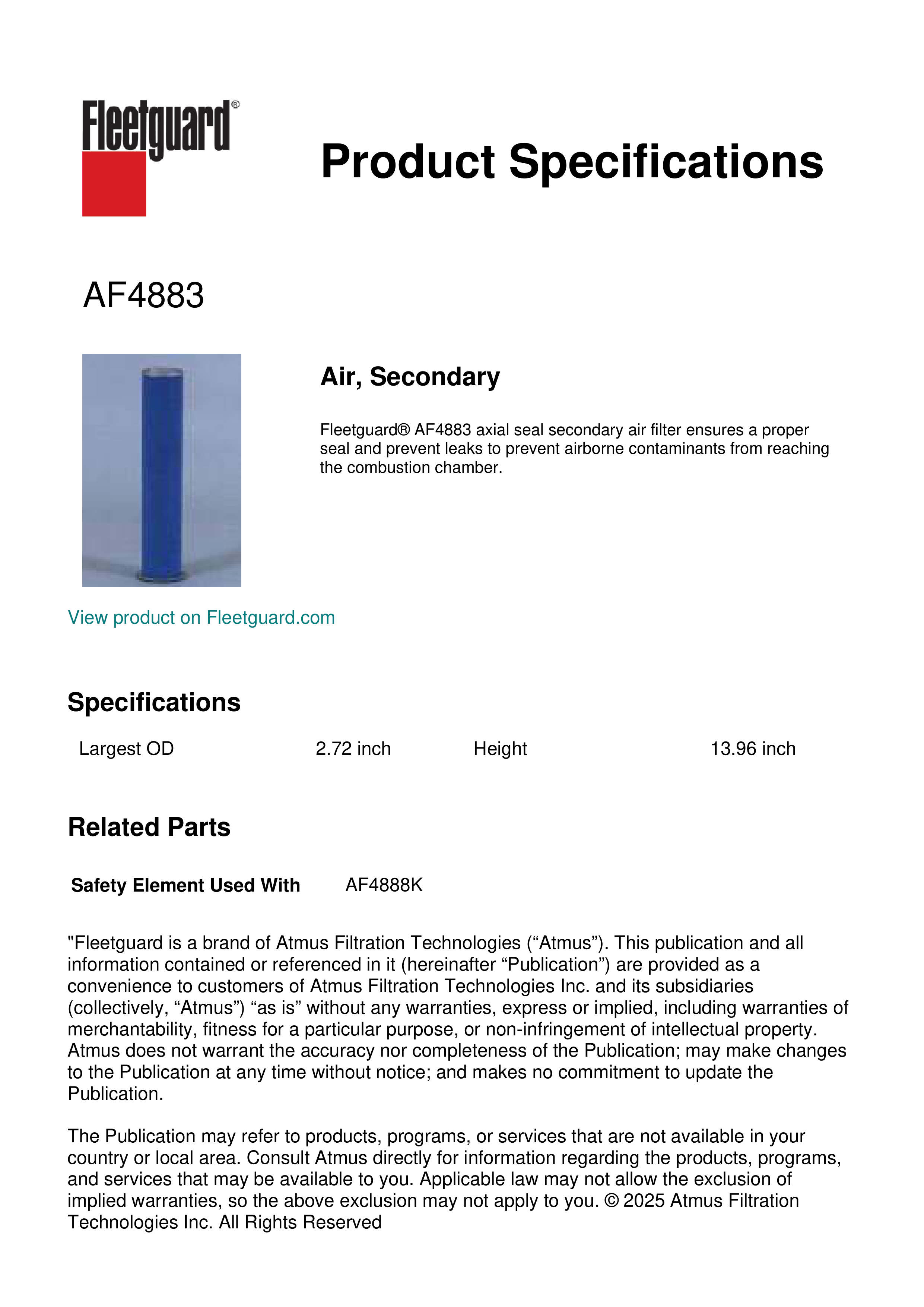 Fleetguard® AF4883 axial seal secondary air filter ensures a proper seal and prevent leaks to prevent airborne contaminants from reaching the combustion chamber.Specification