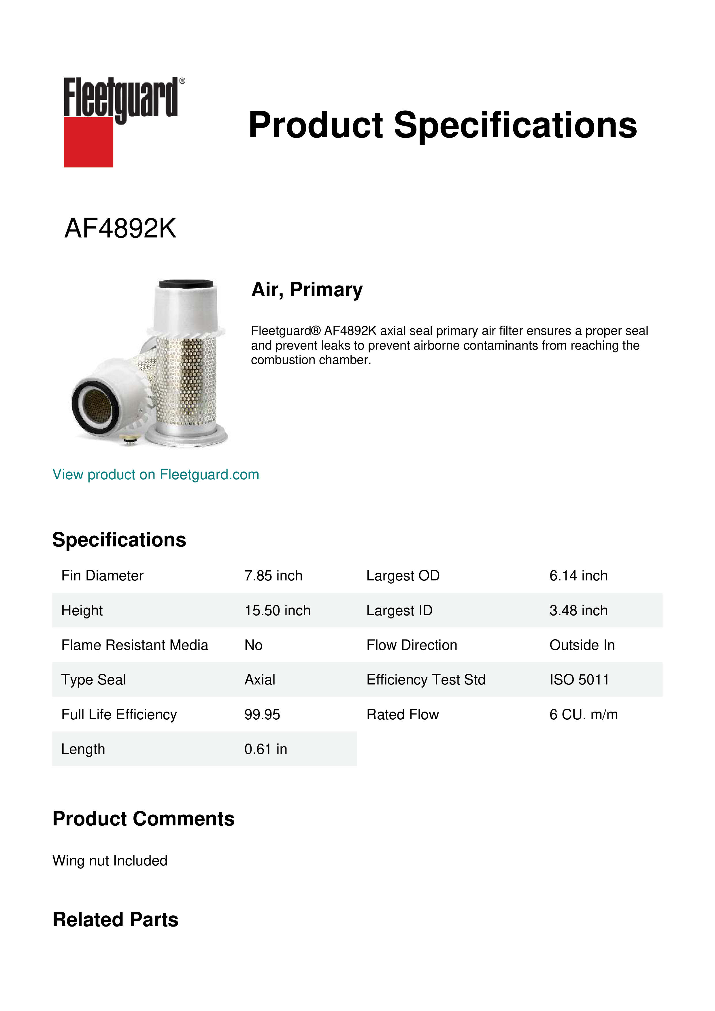 Fleetguard® AF4892K axial seal primary air filter ensures a proper seal and prevent leaks to prevent airborne contaminants from reaching the combustion chamber.Specification