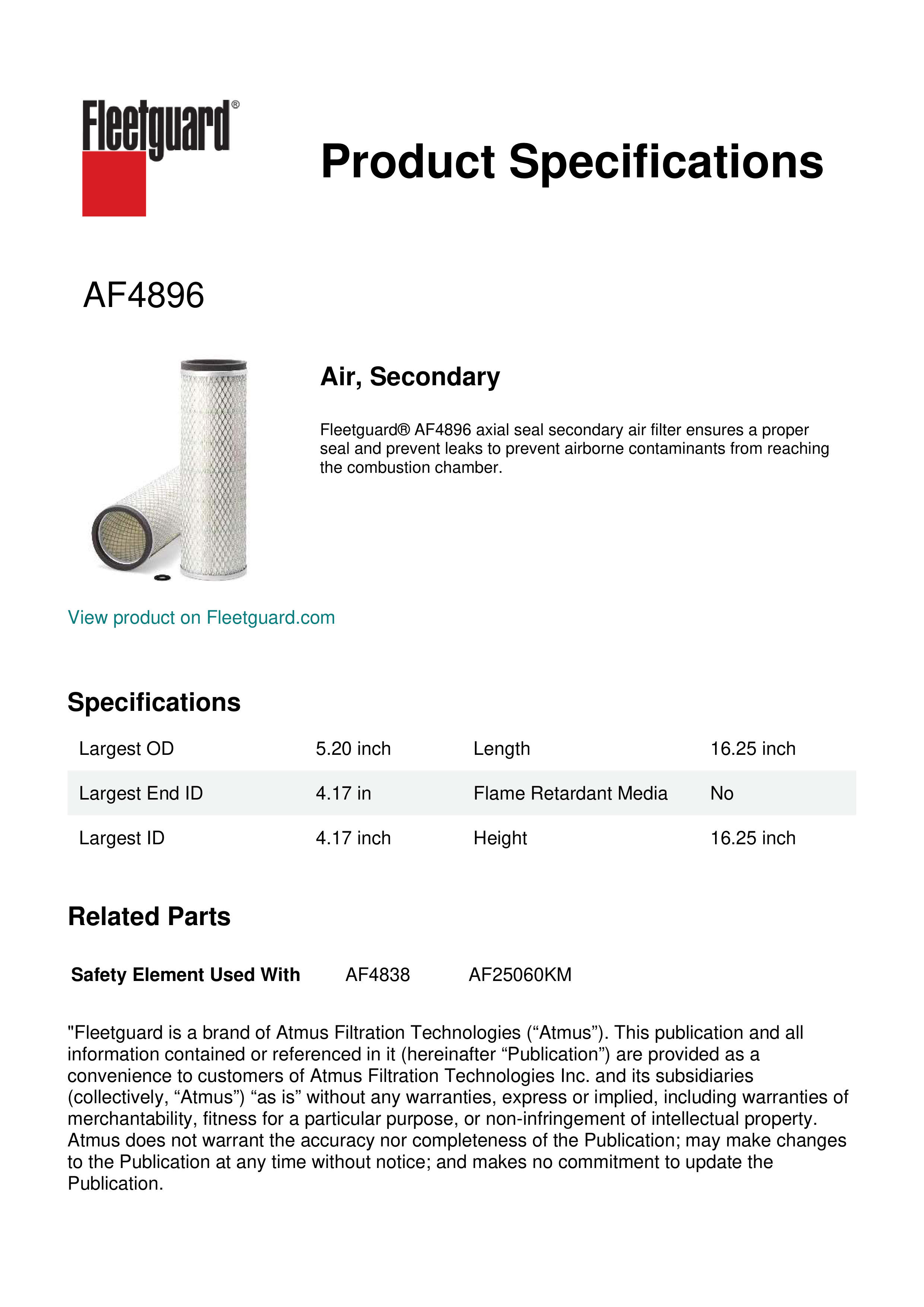 Fleetguard® AF4896 axial seal secondary air filter ensures a proper seal and prevent leaks to prevent airborne contaminants from reaching the combustion chamber.Specification