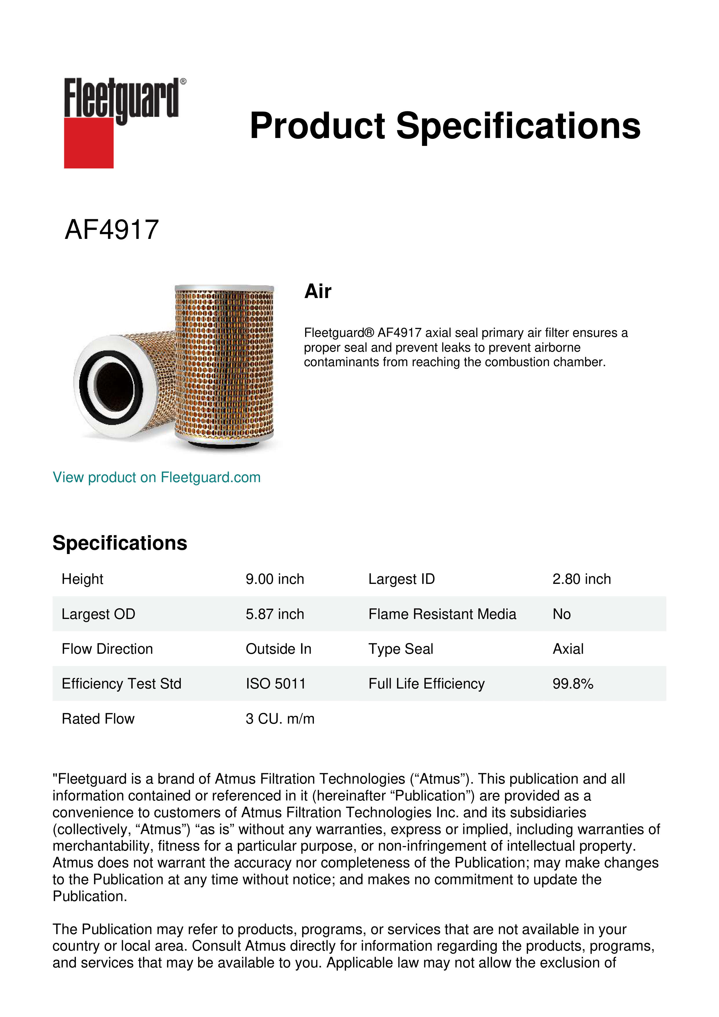 Fleetguard® AF4917 axial seal primary air filter ensures a proper seal and prevent leaks to prevent airborne contaminants from reaching the combustion chamber.