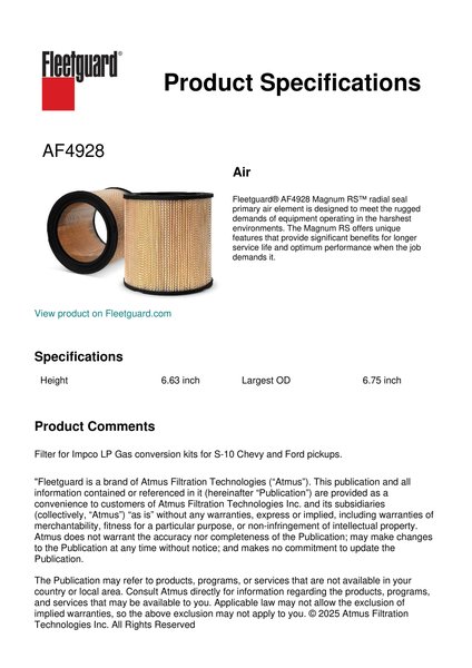 Fleetguard® AF4928 Magnum RS™ radial seal primary air element is designed to meet the rugged demands of equipment operating in the harshest environments. The Magnum RS offers unique features that provide significant benefits for longer service life and optimum performance when the job demands it.Specification