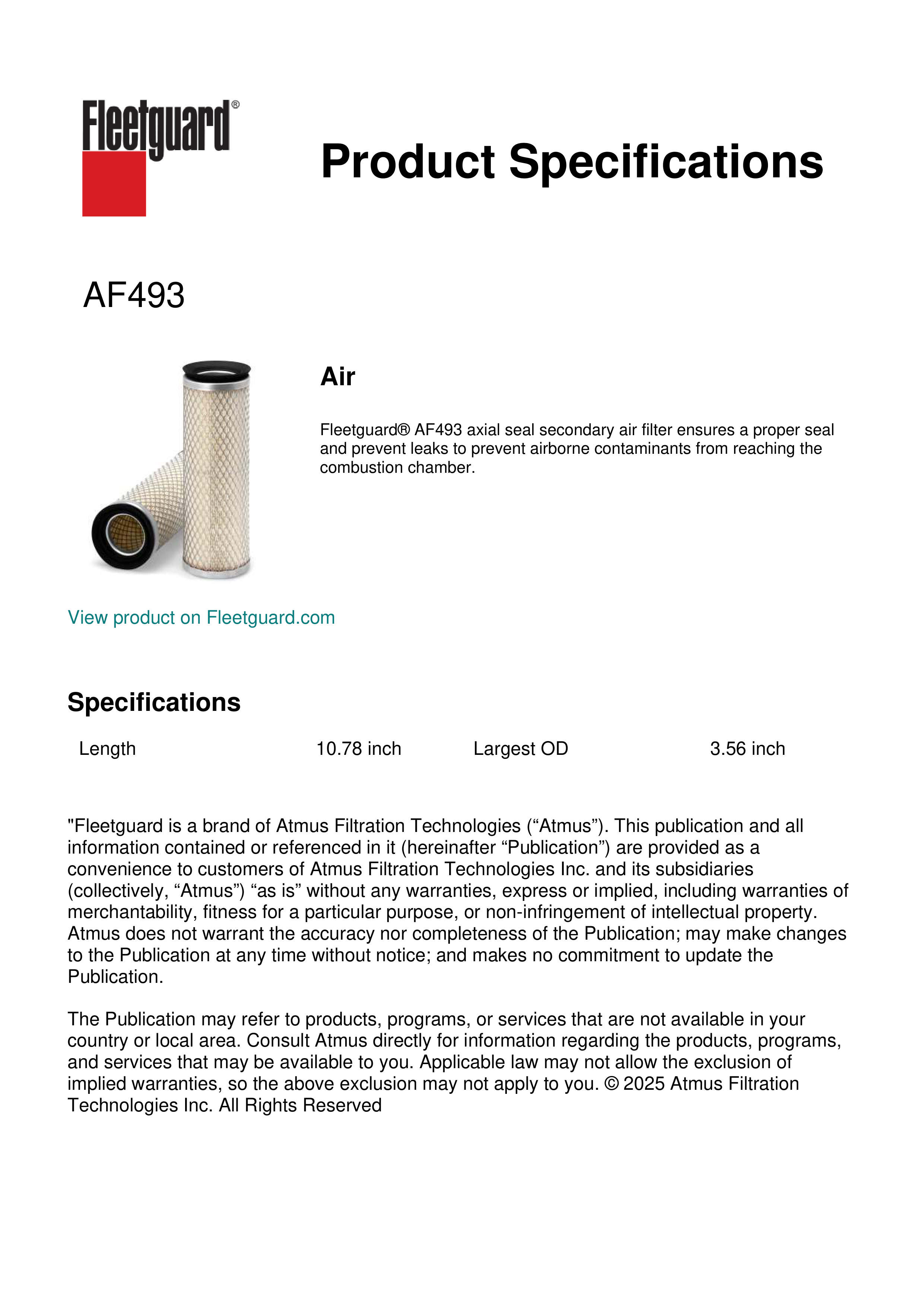 Fleetguard® AF493 axial seal secondary air filter ensures a proper seal and prevent leaks to prevent airborne contaminants from reaching the combustion chamber.Specification