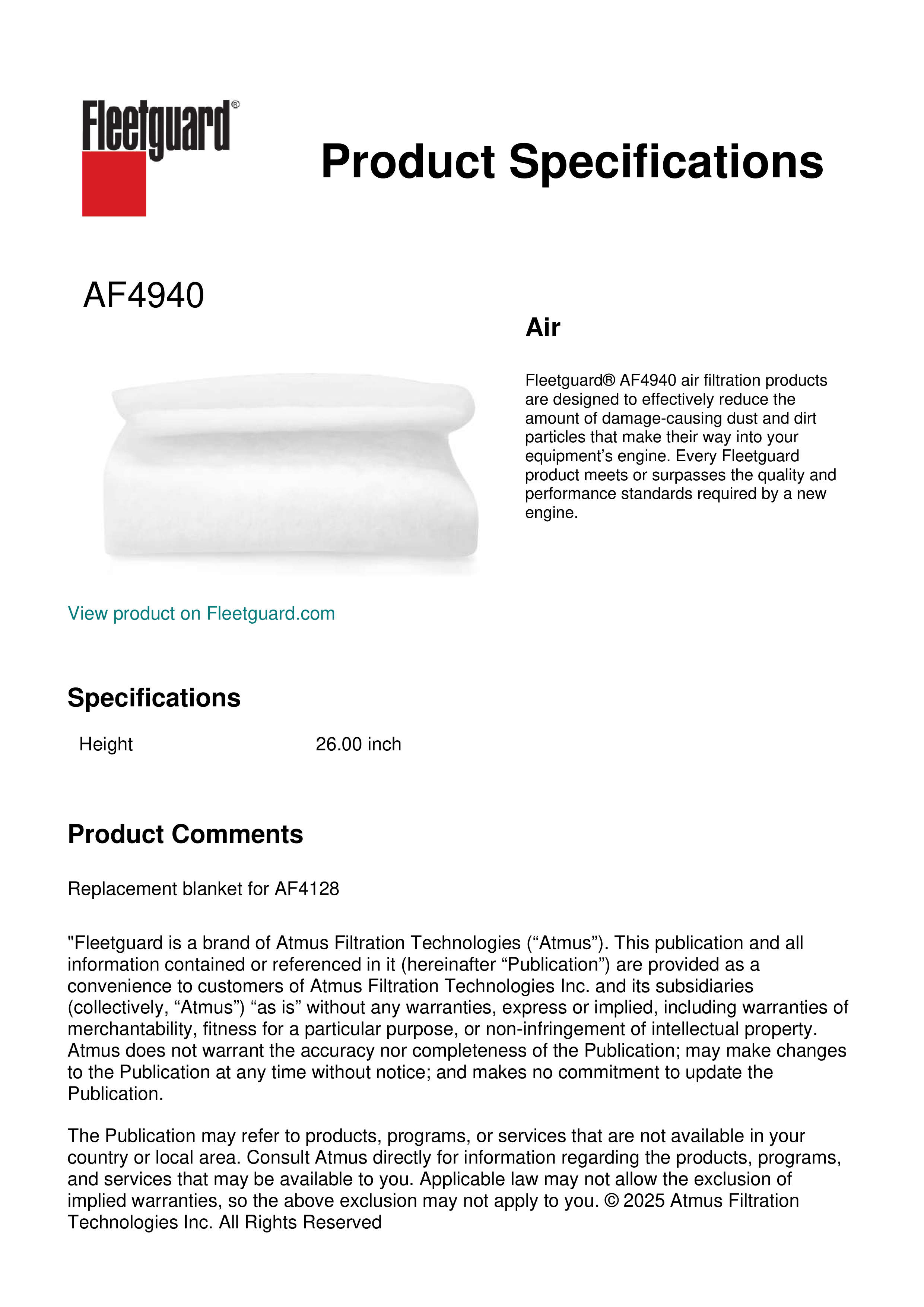 Fleetguard® AF4940 air filtration products are designed to effectively reduce the amount of damage-causing dust and dirt particles that make their way into your equipment’s engine. Every Fleetguard product meets or surpasses the quality and performance standards required by a new engine.Specification