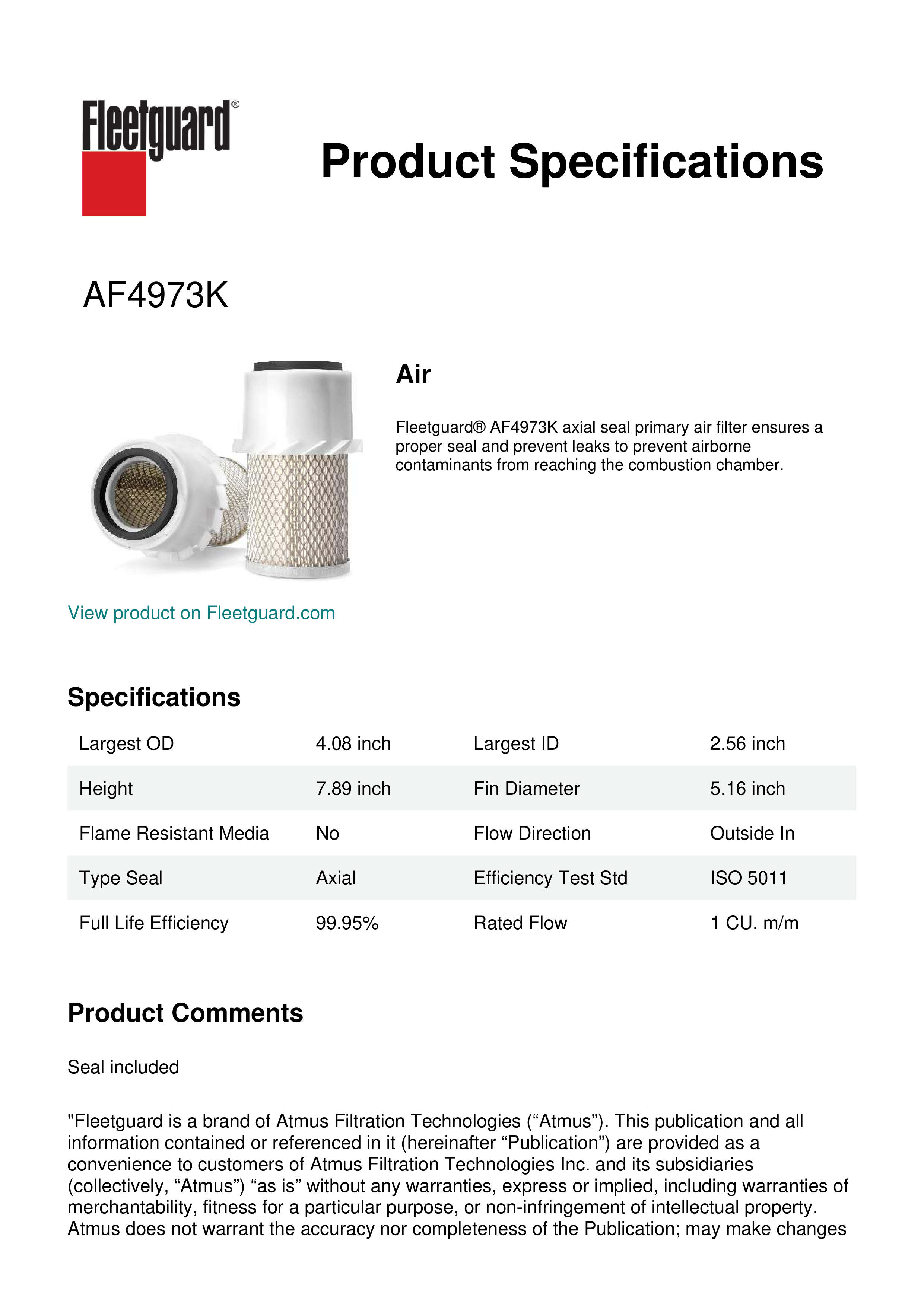 Fleetguard® AF4973K axial seal primary air filter ensures a proper seal and prevent leaks to prevent airborne contaminants from reaching the combustion chamber.Specification