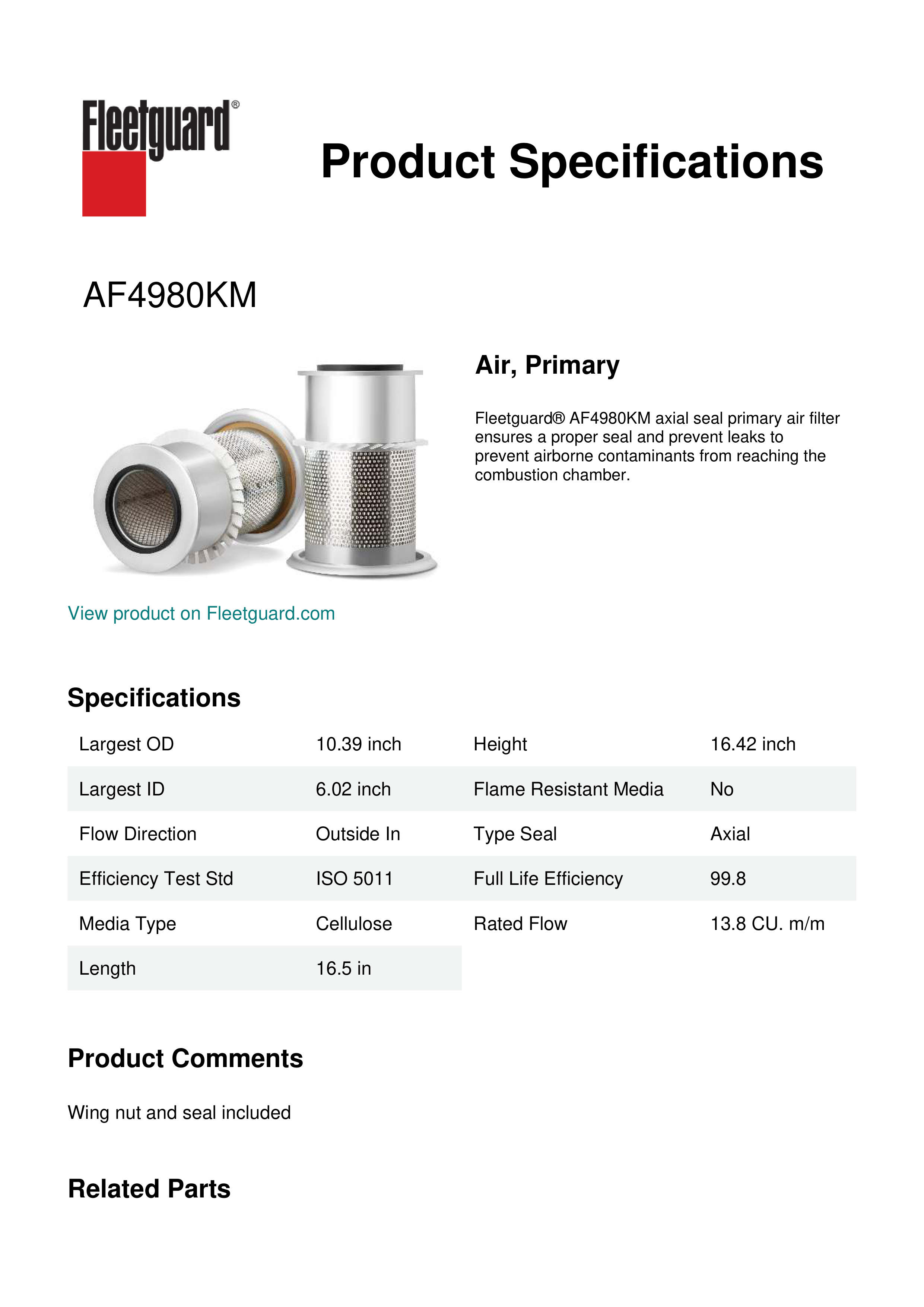 Fleetguard® AF4980KM axial seal primary air filter ensures a proper seal and prevent leaks to prevent airborne contaminants from reaching the combustion chamber.Specification