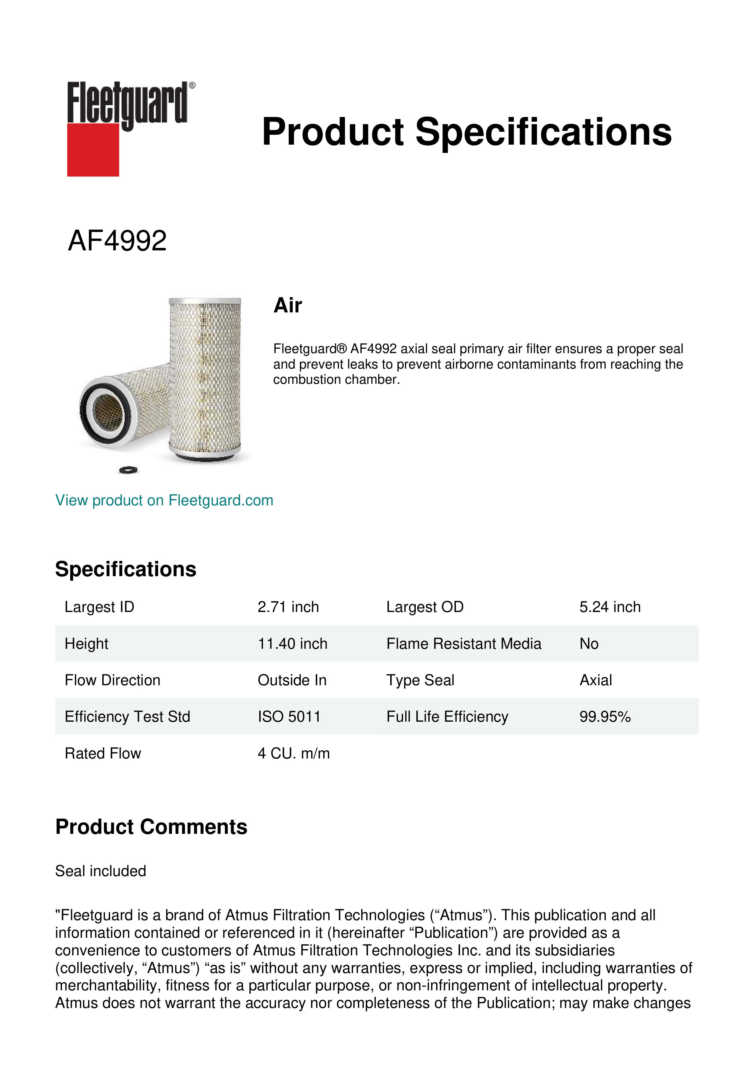 Fleetguard® AF4992 axial seal primary air filter ensures a proper seal and prevent leaks to prevent airborne contaminants from reaching the combustion chamber.
