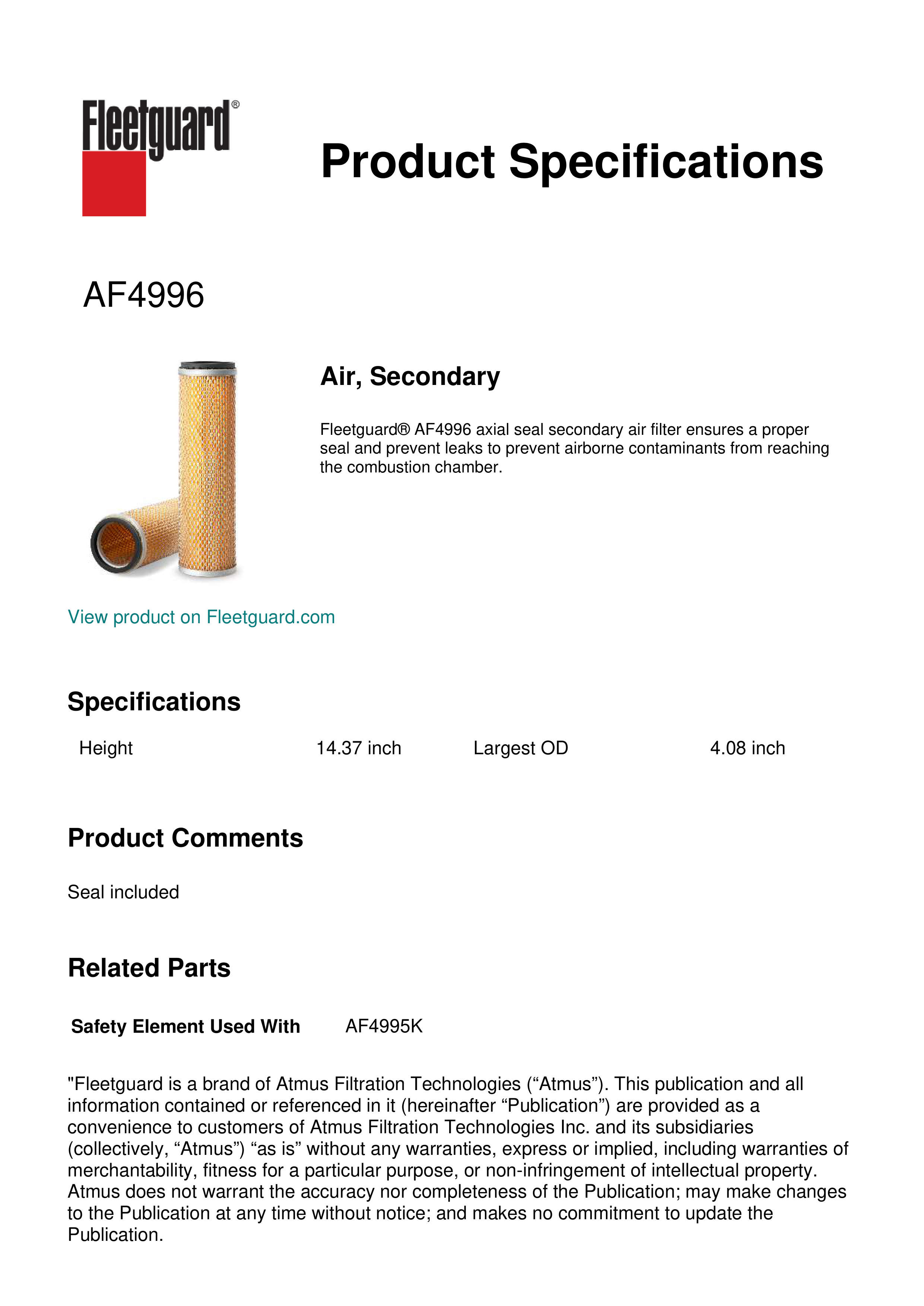 Fleetguard® AF4996 axial seal secondary air filter ensures a proper seal and prevent leaks to prevent airborne contaminants from reaching the combustion chamber.Specification
