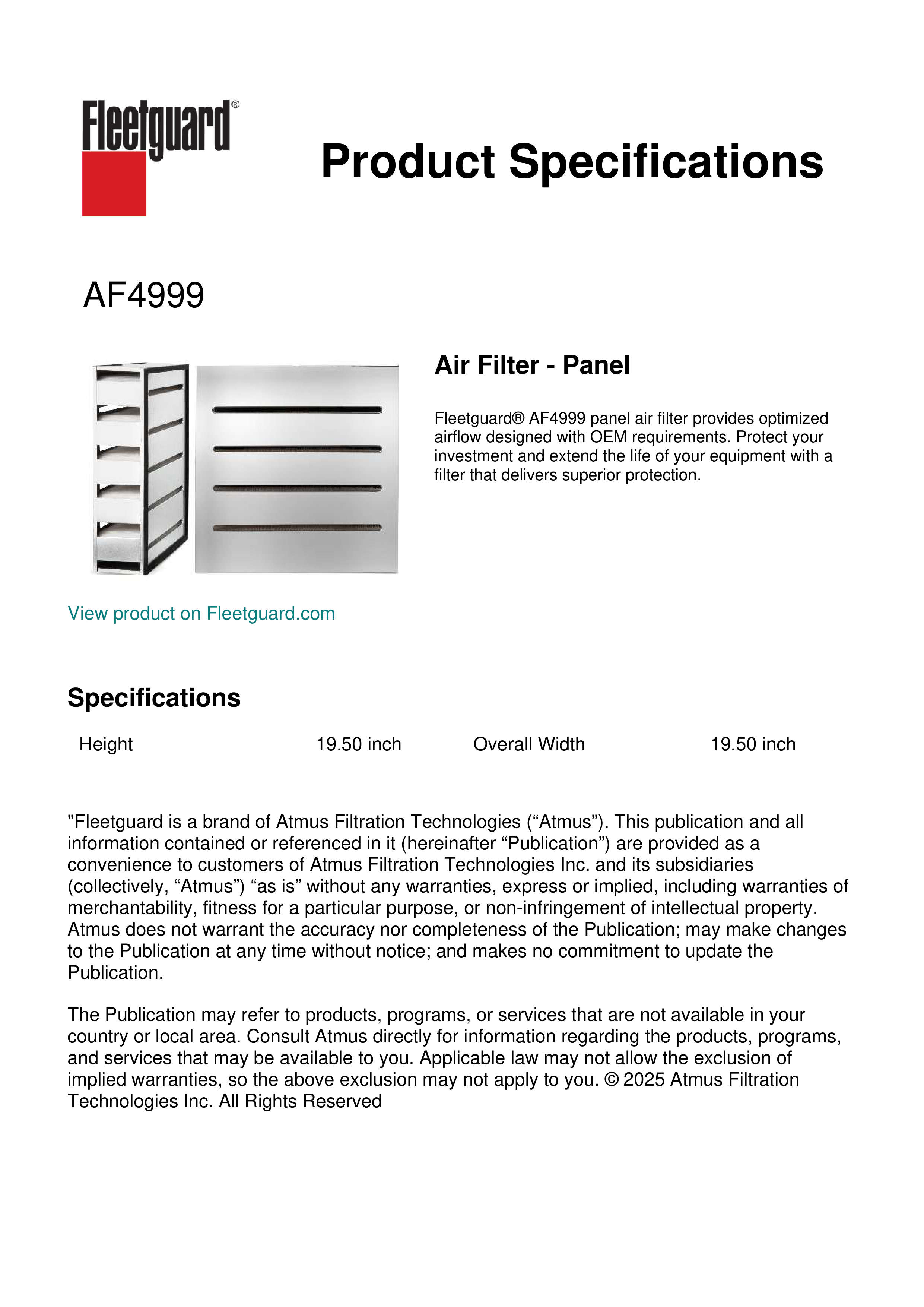 Fleetguard® AF4999 panel air filter provides optimized airflow designed with OEM requirements. Protect your investment and extend the life of your equipment with a filter that delivers superior protection.Specification