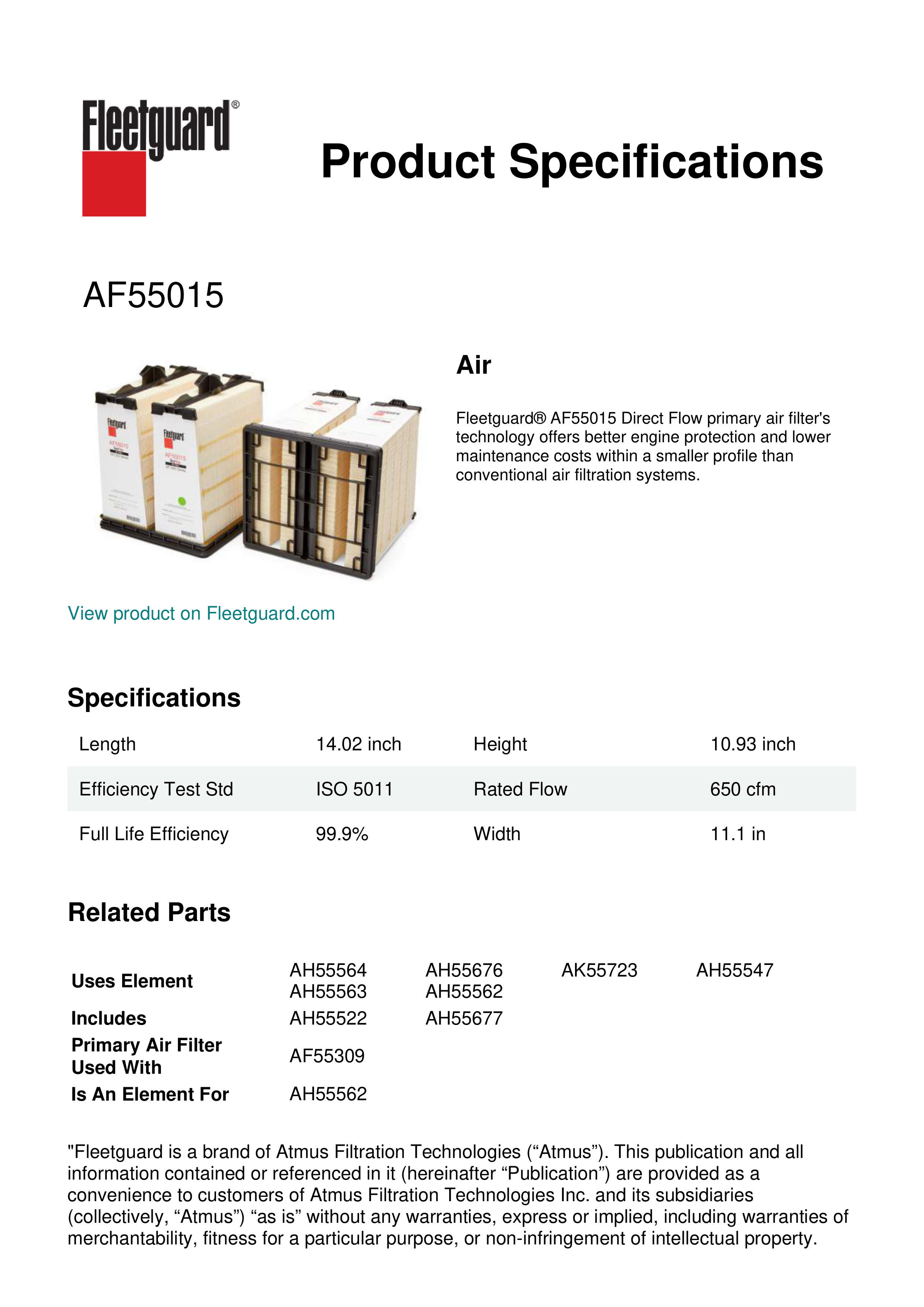 Fleetguard® AF55015 Direct Flow primary air filter's technology offers better engine protection and lower maintenance costs within a smaller profile than conventional air filtration systems.Specification
