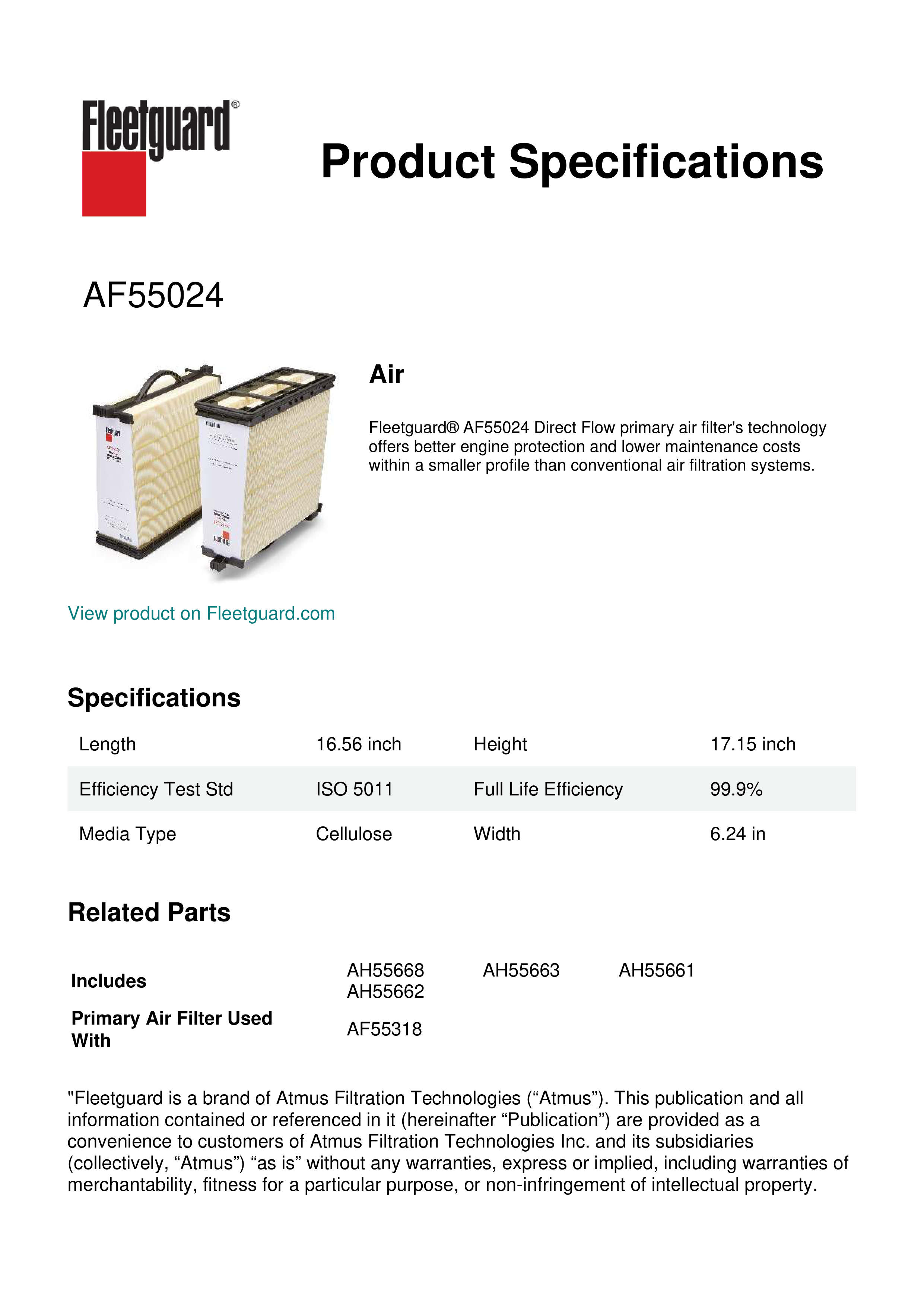 Fleetguard® AF55024 Direct Flow primary air filter's technology offers better engine protection and lower maintenance costs within a smaller profile than conventional air filtration systems.Specification