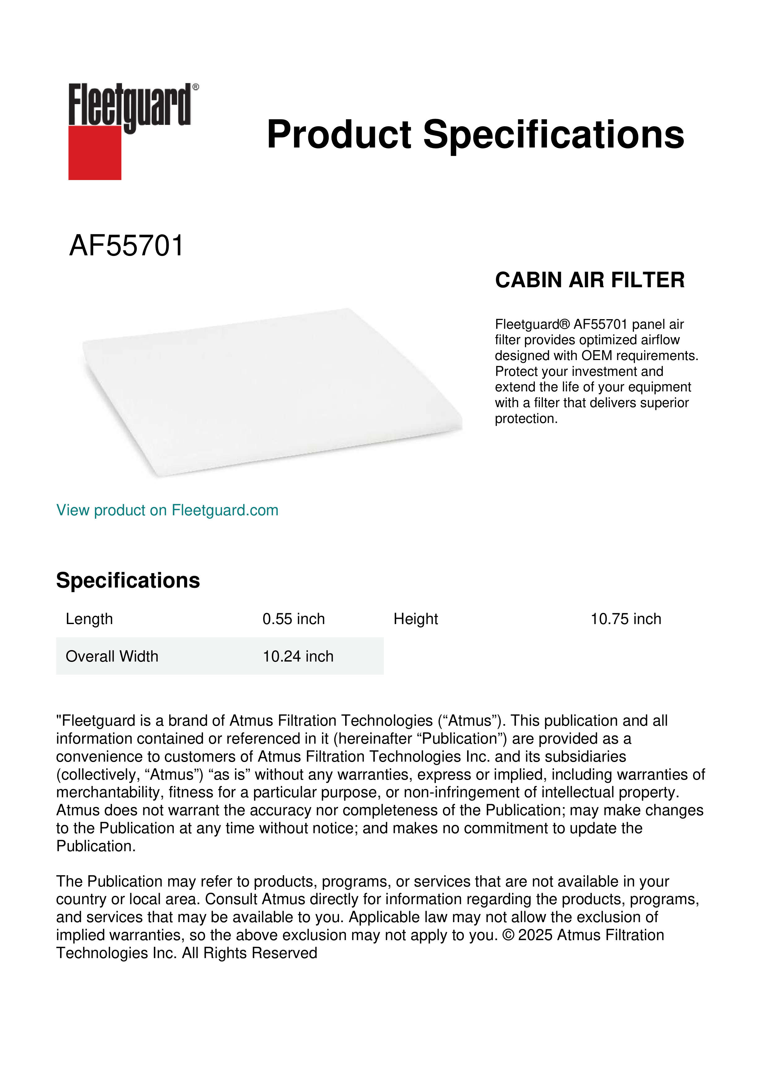 Fleetguard® AF55701 panel air filter provides optimized airflow designed with OEM requirements. Protect your investment and extend the life of your equipment with a filter that delivers superior protection.Specification