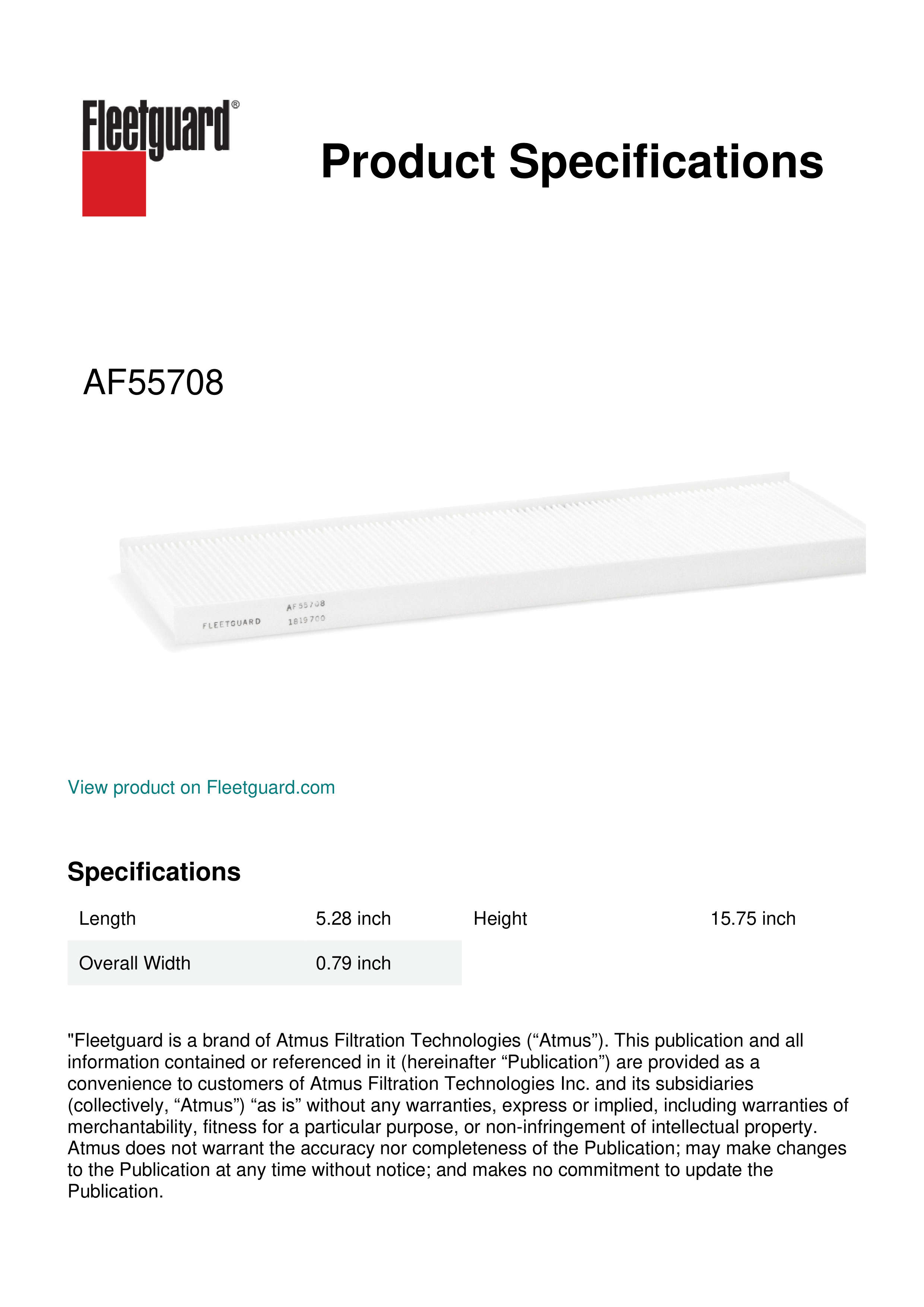 Fleetguard® AF55708 panel air filter provides optimized airflow designed with OEM requirements. Protect your investment and extend the life of your equipment with a filter that delivers superior protection.Specification