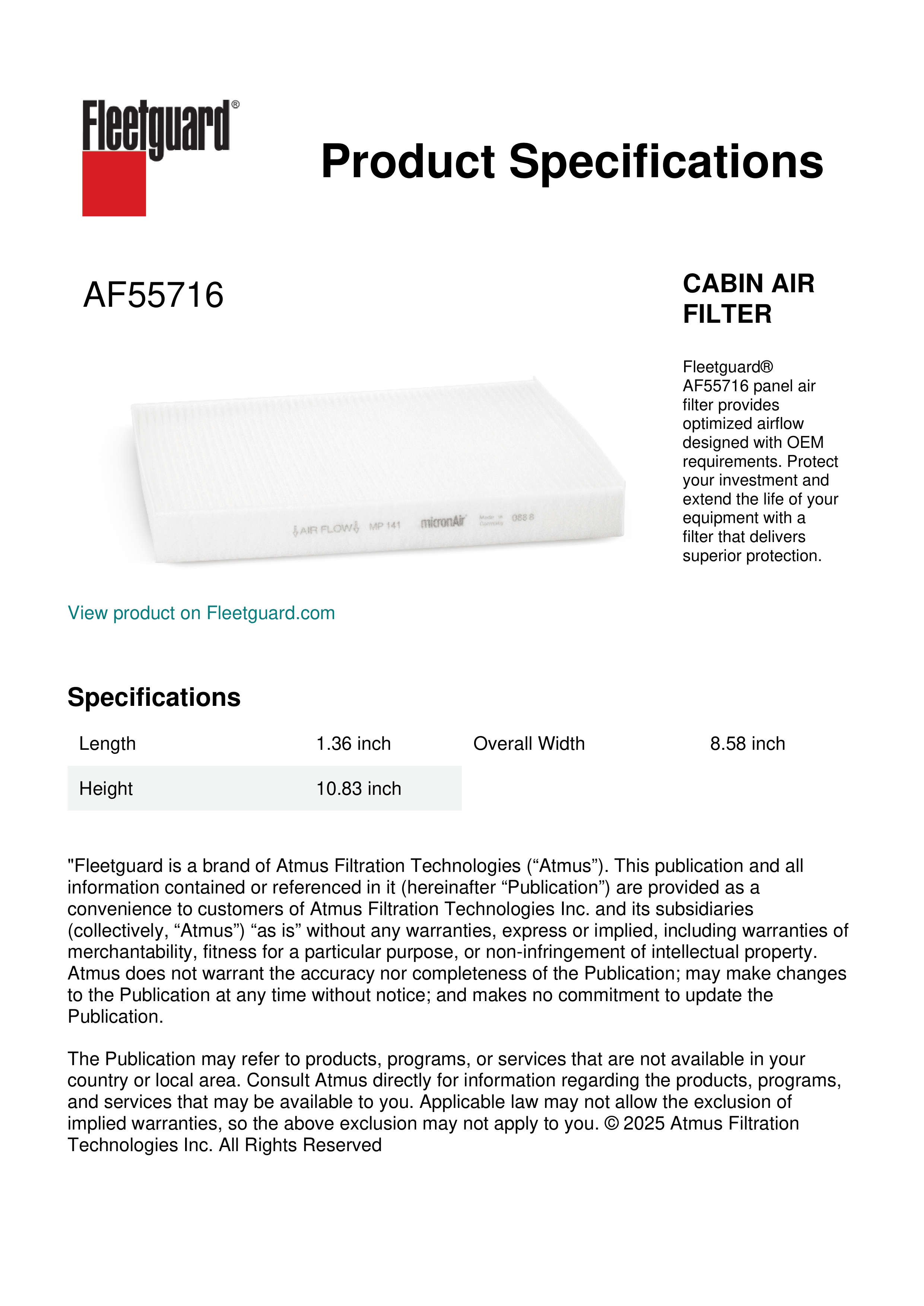 Fleetguard® AF55716 panel air filter provides optimized airflow designed with OEM requirements. Protect your investment and extend the life of your equipment with a filter that delivers superior protection.Specification