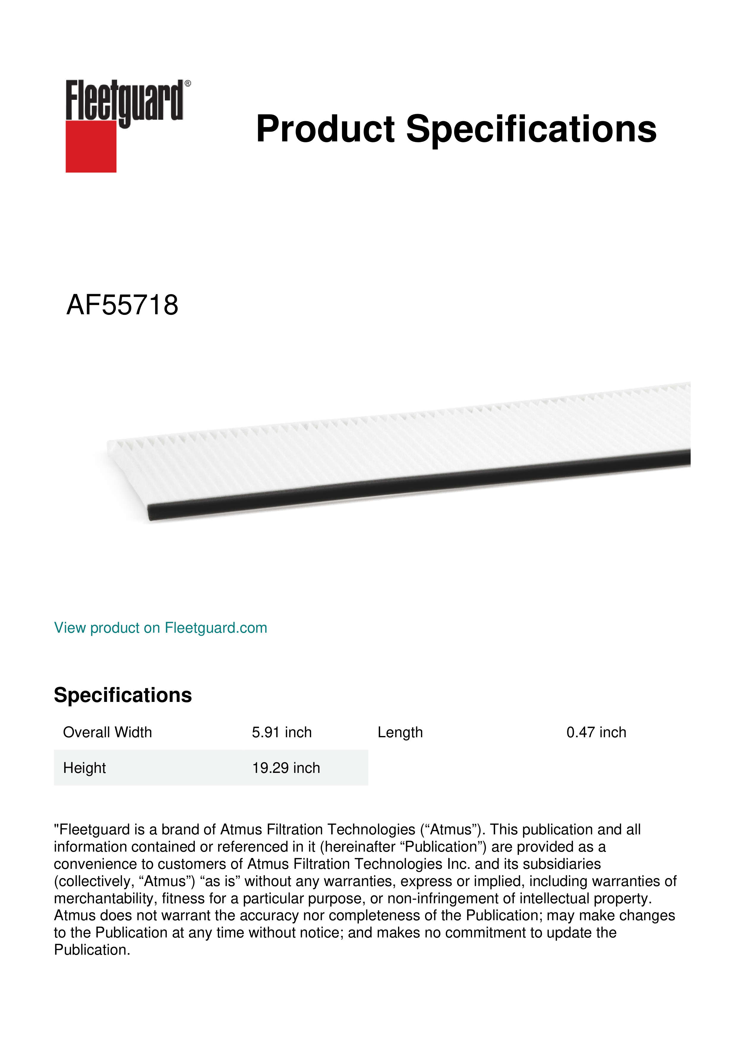 Fleetguard® AF55718 panel air filter provides optimized airflow designed with OEM requirements. Protect your investment and extend the life of your equipment with a filter that delivers superior protection.Specification