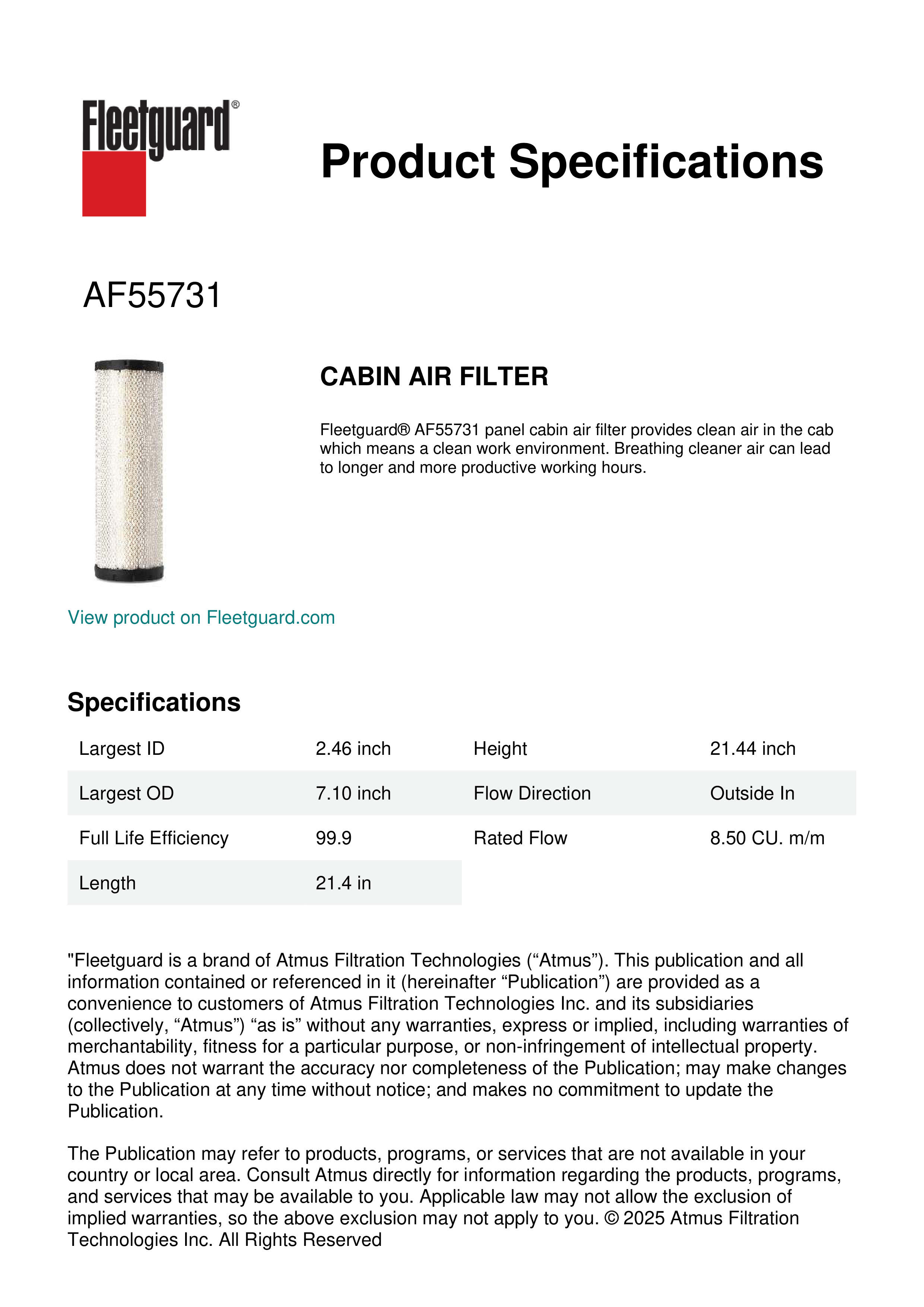 Fleetguard® AF55731 panel cabin air filter provides clean air in the cab which means a clean work environment. Breathing cleaner air can lead to longer and more productive working hours.Specification