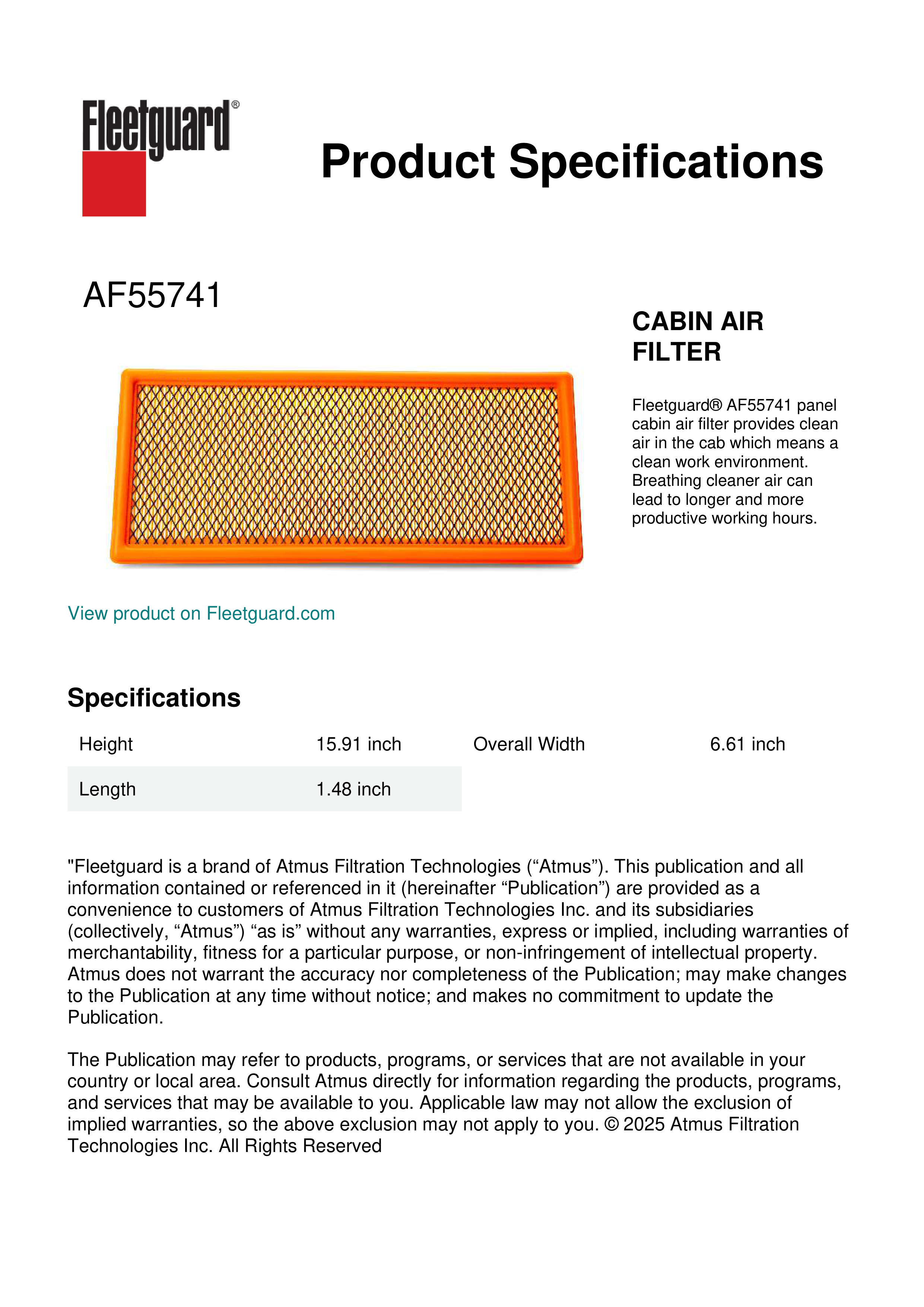 Fleetguard® AF55741 panel cabin air filter provides clean air in the cab which means a clean work environment. Breathing cleaner air can lead to longer and more productive working hours.Specification